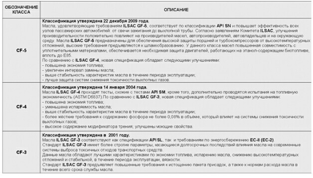 Стандарт Международного американо-японского комитета практически повторяет API. Например, масло ISLAC GL-3 аналогично смазочному материалу API SL. Чем больше цифра в обозначении, тем более современным и качественным должен быть смазочный материал.