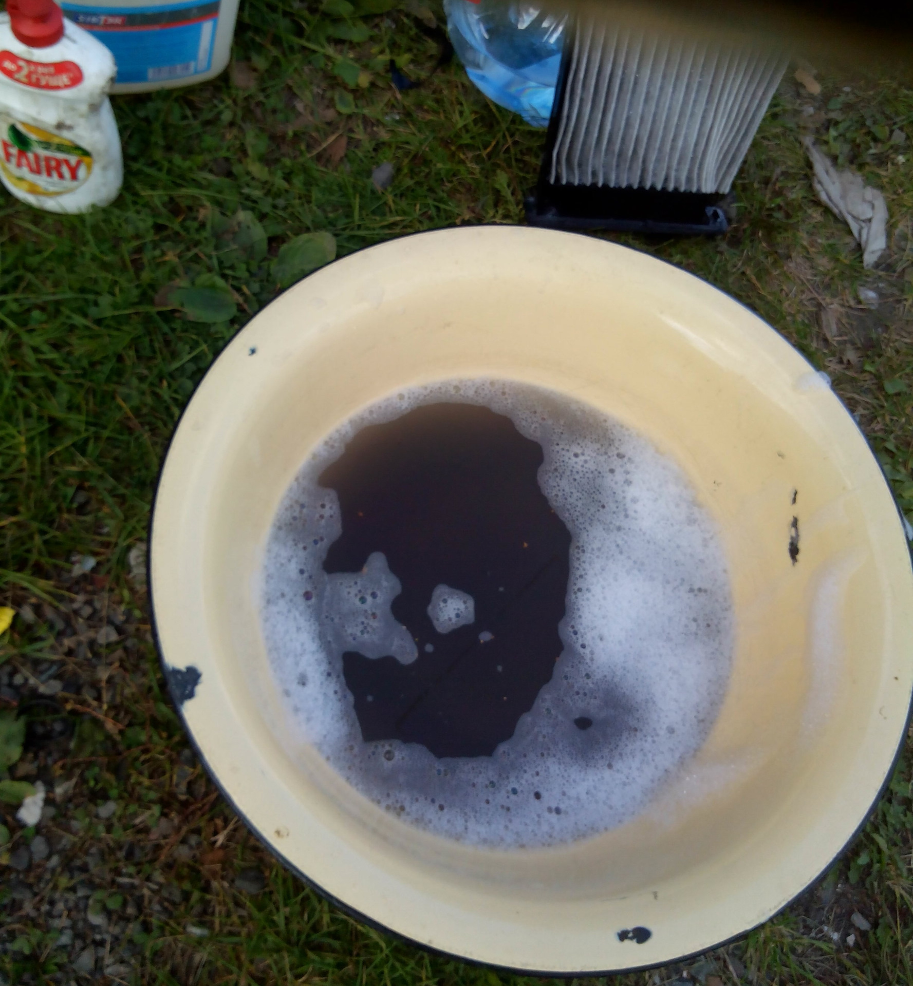 1. Снятый фильтр на 5-10 минут замачиваем в тазике с теплой водой с моющим средством (стиральный порошок или что-то типа Фэйри). После чего в меру интенсивно его булькаем, удерживая за пластиковый корпус. Важно не повредить фильтрующий элемент (ультразвуком бы его попробовать почистить, что ли… )