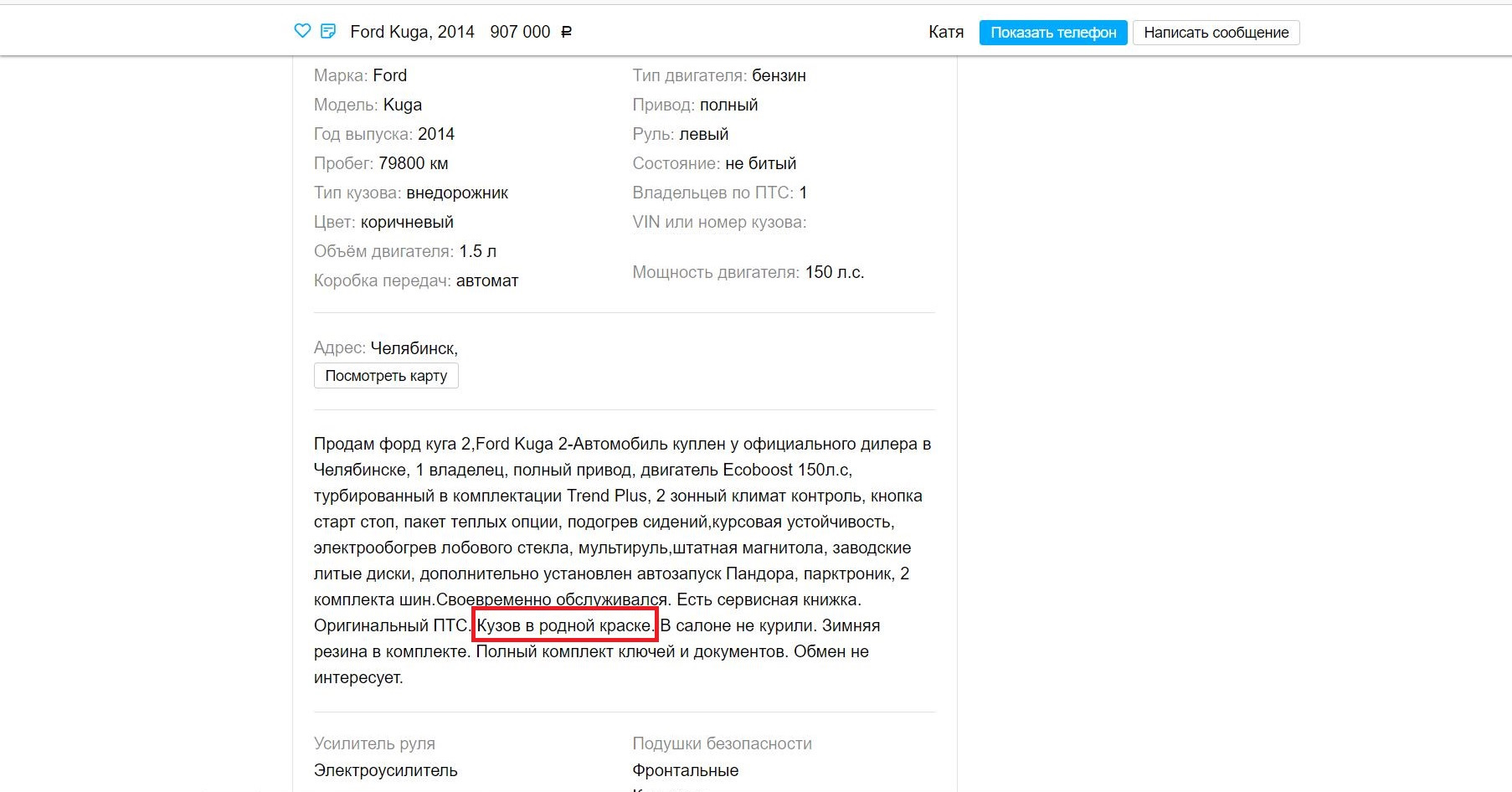 Двигатель 1.6 л., а не 1.5 л., как указано в объявлении. А показывала девушка эту машину, чтобы сказать, что она ничего не знала. Там такая история разыгралась передо мной… девушка начала куда-то звонить, что-то узнавать и очень профессионально делать вид, что не знает, как машина, которую она покупала НОВОЙ, стала вдруг битой и собранной тайваньскими запчастями. Лучшая женская роль первого плана в 2018 году принадлежит продавщице этой Kuga! Вы не верьте в то, что Вам говорят, верьте фактам. И не перекупы их обманывают. И не дилеры плохие. А люди сами разбивают машины, а отвечать за это (рублем), не хотят. А ведь продавал собственник, и один хозяин, не перекуп, не салон и не какой-то дилер. Продавали как говорится — "из дома". И делали честное лицо, что не знают, что с машиной. А это очень жалкое зрелище, когда единственный владелец сочиняет истории на ходу и "путается в показаниях". Я бы от такого позора пил неделю, чтобы забыть всё. Жалкое зрелище, когда тебя макают в твое же говно, которое ты же и сделал, но не хочешь брать за него ответственность. Теперь понимаете, почему не парень показывал эту машину? С девушки вроде, как и спрос меньше. Девушке легче поверить. Девушка скажет ничего не знает, а лохи это схавают. Повторю, машину продает девушка? Смотрите её с еще большим пристрастием! И если найдете хоть одно подозрение на несоответствие, бегите от этой машины.
