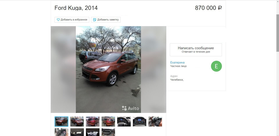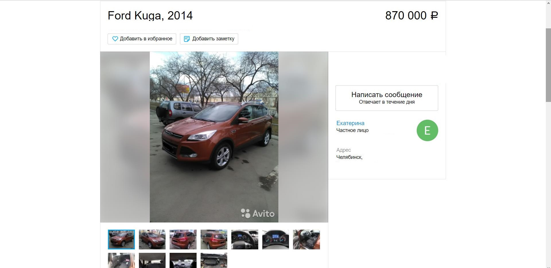 Начнем с Ford Kuga 2014 года, 1 владелец, пробег около 80.000 км, 1.5 л. на 150 сил. В объявлении четко сказано, машина не бита, не крашена, не подкрашена, и не имеет никаких ДТП. И вообще, эта машина своевременно обслуживалась, да еще и зимняя резина есть! А это значит, если переехать жить в Сочи, то можно продать резину и получить прибыль. Пока одни плюсы! И все это чудо за смешные 907.000 рублей, каких не хватит даже на топовый Solaris. Причина продажи — отъезд на ПМЖ на дальний восток, а там, в мире правого руля этот Ford не будет нужен никому. Поэтому решили продать здесь, и уехать на ДВ.