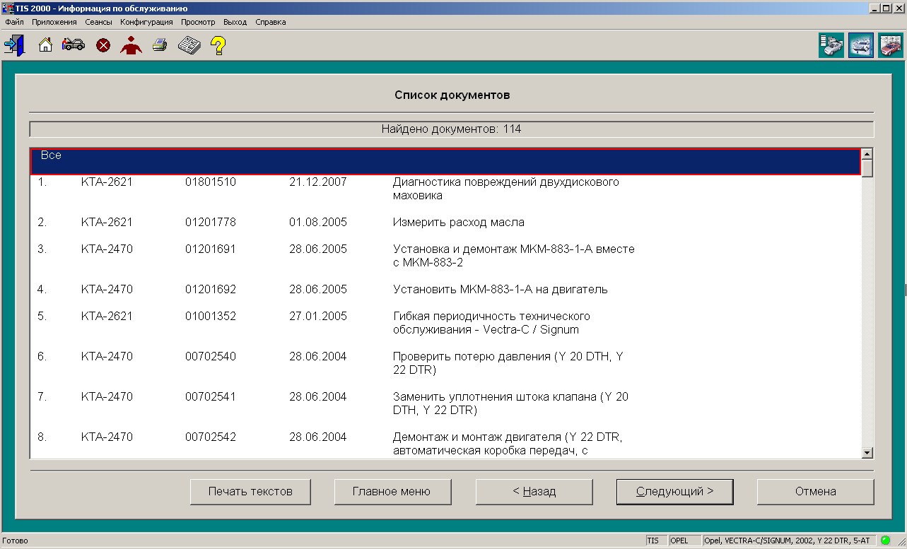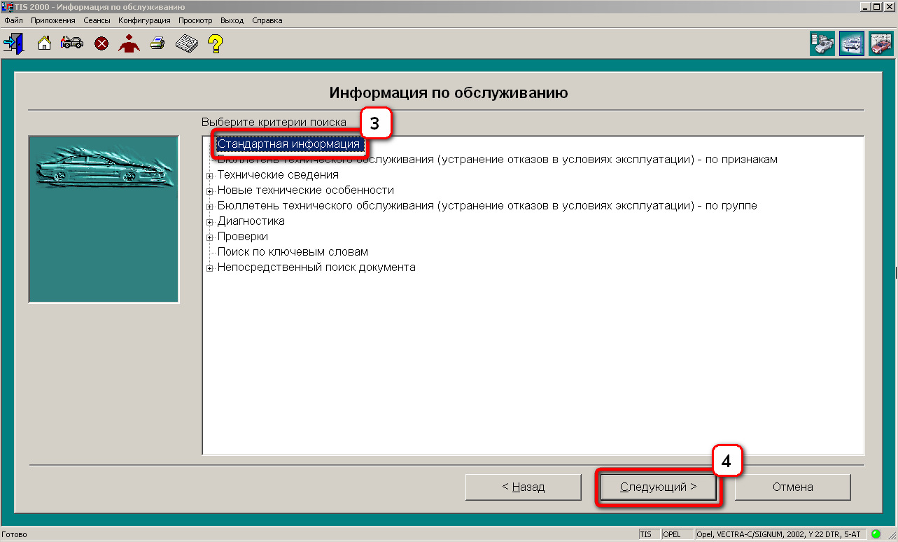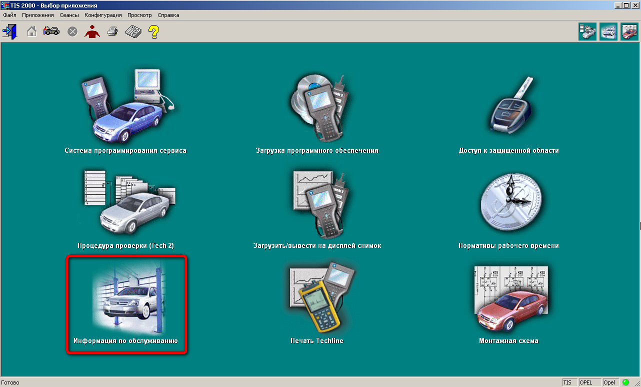1. После запуска TIS 2000 необходимо выбрать приложение "Информация по обслуживанию"