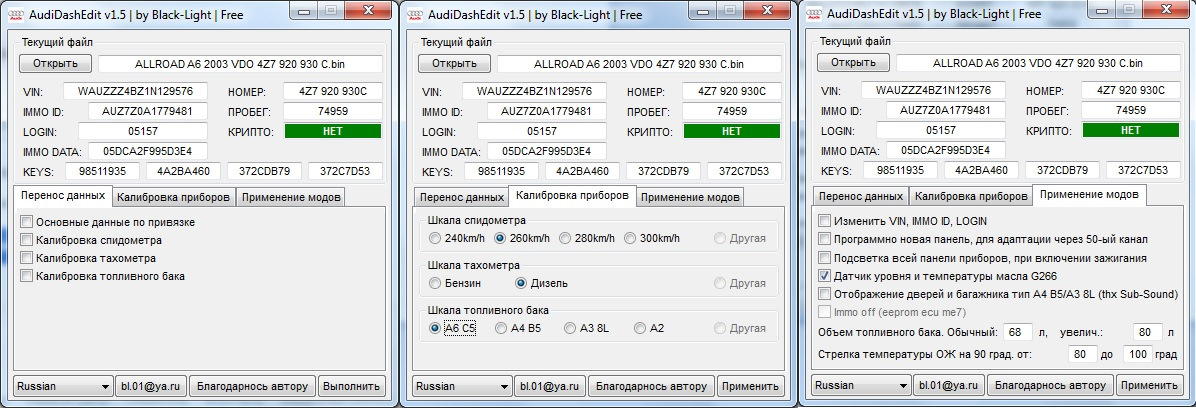 Поддерживаются панели приборов ТОЛЬКО: AUDI A6/S6/RS6 C5, A4/S4/ RS4 B5, A3/S3 8L, A2, A4B6 (только чтение decrypted), TT mk1. Панели других авто не поддерживаются!