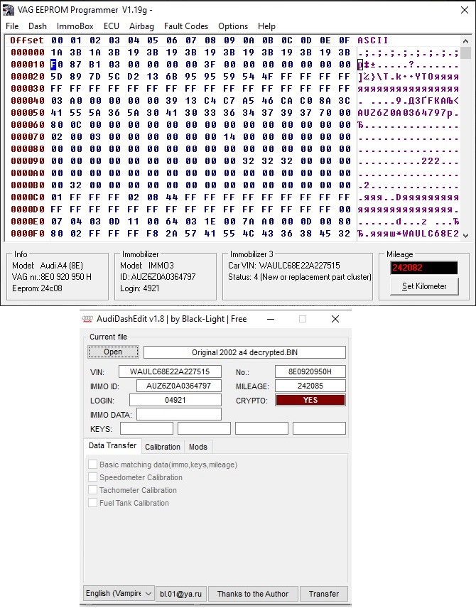 3.6. Заливаете полученный дамп в новую панель приборов. Если все верно то машина должна будет заводиться и пробег будет из старой панели (если перенос данных был из eeprom эбуд, то пробег не перенесется, его нет в эбуд, поэтому пробег нужно будет выставить программой VAG EEPROM Programmer by BP)