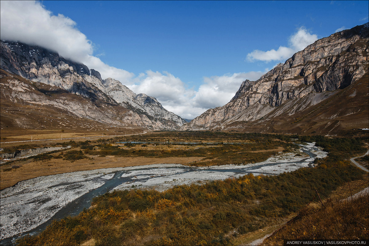 Даргавское ущелье — это топ, особенно если вы путешествуете осенью и вам повезло с погодой. Кристально чистое небо, оранжевые краски осени, горные реки и заснеженные вершины: это потрясающе!