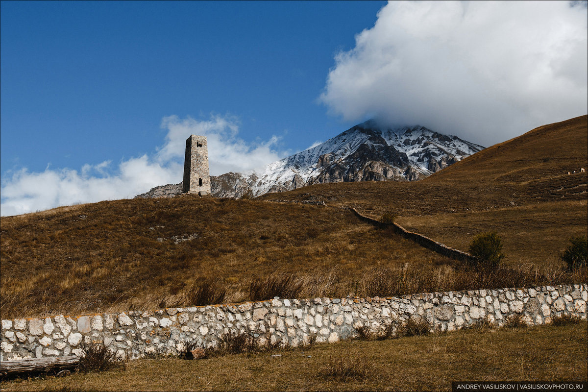 На самом верху комплекса возвышается еще один интересный объект — боевая башня Аликовых. Она выглядит просто потрясающе на фоне синего неба и заснеженных вершин. Увы, башня достаточно сильно разрушена и на ее стенах висит объявление о том, что не стоит пытаться забраться на ее верх. Я решил быть благоразумным до конца и к объявлению прислушался.