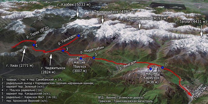 От Даргавса на восток идет дорога на Дагавский (Зеленый) перевал. Через него она дальше идет в с.Кани, потом спускается вниз и мимо места, где было с.Нижний Кармадон, идет на север, подходит к теснинке (Кармадонские ворота, которые, собственно и остановили основную массу селя в 2002г.). Возле самой теснинки увидите железный мостик "направо" через Гизельдон, на грунтовку, идущую на юго-восток. По ней, мимо с.Горная Саниба подниметесь на Санибанский перевал и далее — спуститесь на Военно-Грузинскую дорогу чуть выше с.Чми.