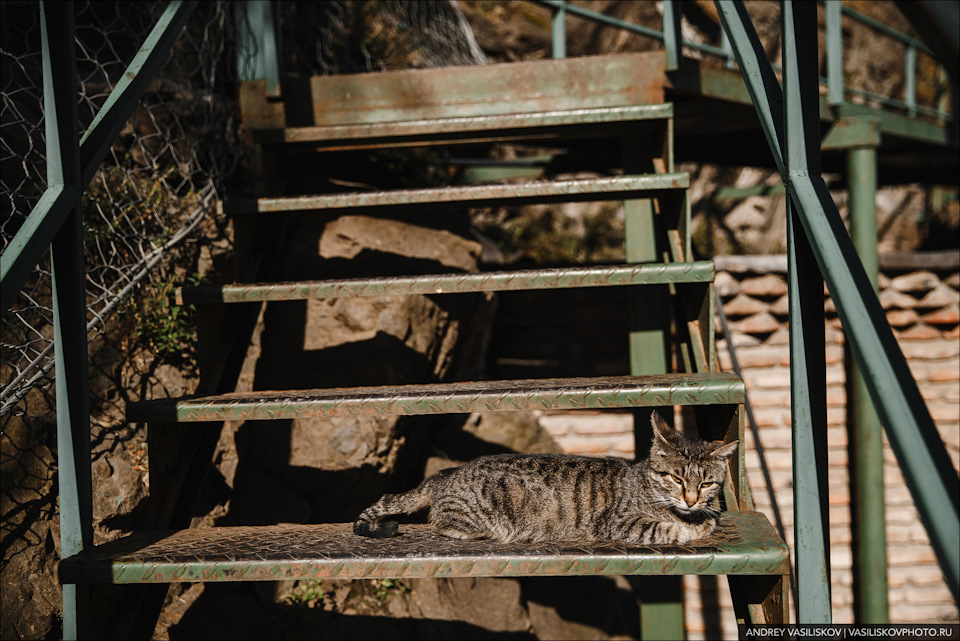 1. Итак, вы в Тбилиси! Чемоданы побросаны в гостиничном номере, телефоны заряжены, одета удобная обувь — лет'с гоу, в общем. Куда ехать? Ну, конечно же, в центр! А конкретно — в район Сололаки. Самое банальное, что сейчас можно сделать — это подняться к крепости Нарикала. У вас два пути: либо канатная дорога за 2,5 лари (чуть больше 60 рублей), либо пешком по лестнице, которая отходит от улицы Асатиани. И сейчас мы выбираем именно пеший вариант. Тут шикарные виды на старый город и много котиков!