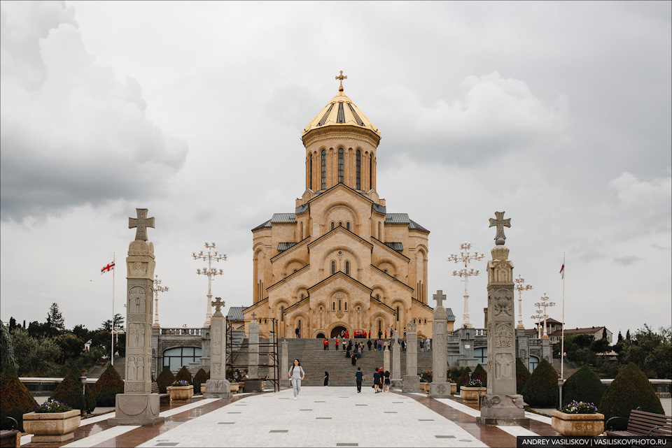 5. Перемещаемся в противоположную часть старого города — к собору Цминда Самеба. Осматриваем самый крупный собор города и после этого вкусно едим в кафешке знаменитой сети "Воды Лагидзе", которая находится прямо на территории собора. Еда тут очень простая, а вот шоколадный и сливочный лимонад попробовать нужно обязательно!