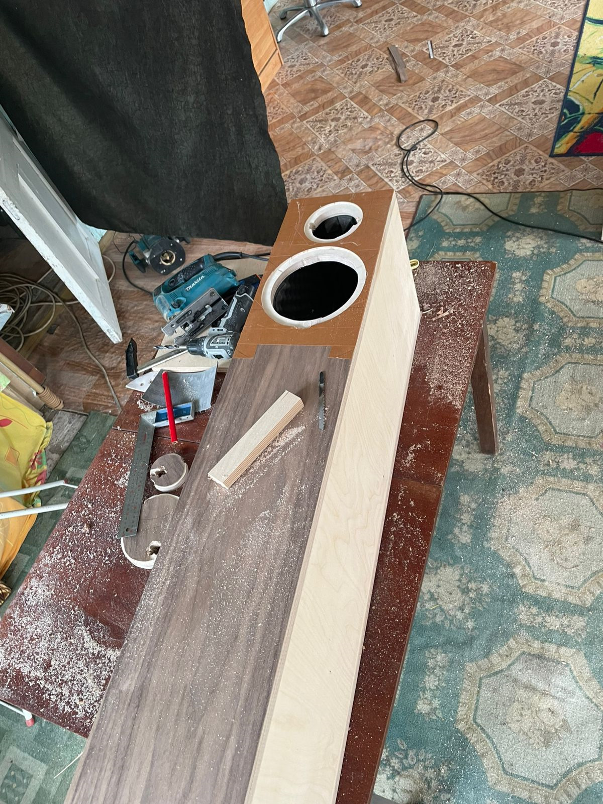Для того чтобы отверстия под динамики выглядели красиво их нужно фрезеровать после наклейки шпона, а шпон на лицевую панель лучше клеить в последнюю очередь, чтобы был нахлест на боковые листы шпона. Короче дырки под динамики пришлось резать в последнюю очередь.