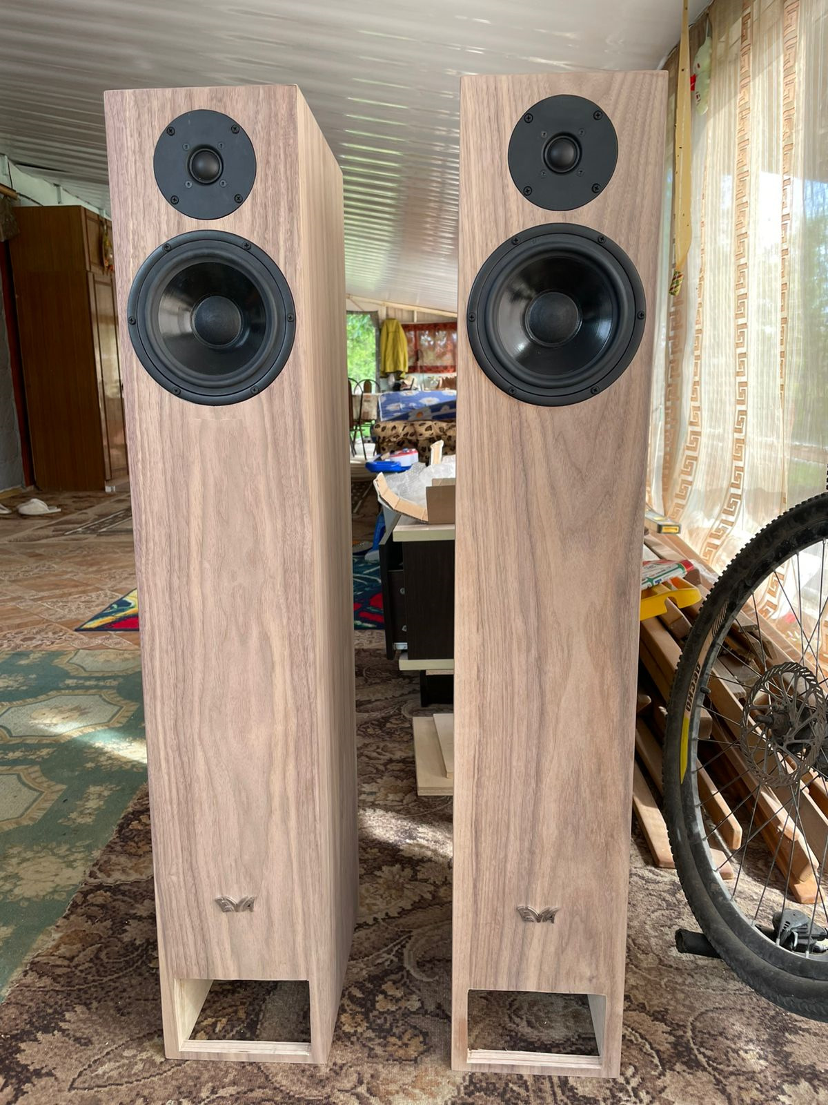 Кстати отец вплотную занялся изготовлением мебели сейчас, поэтому если нужны шпонированные корпуса как у меня имейте ввиду. :-) Но из фанеры делать точно не будем, только из мдф. Если сами будете корпуса делать то советую соблюсти размеры как у меня на чертеже, бас какой-то фантастический, я до сих пор в шоке от их звучания. Но от расстановки многое зависит увы.