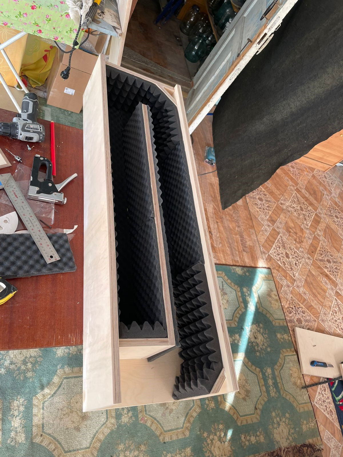 Вата поглощает сч составляющую из порта здесь и снижает частоту настройки лабиринта, паролон поглощает переотражения сч диапазона внутри канала.