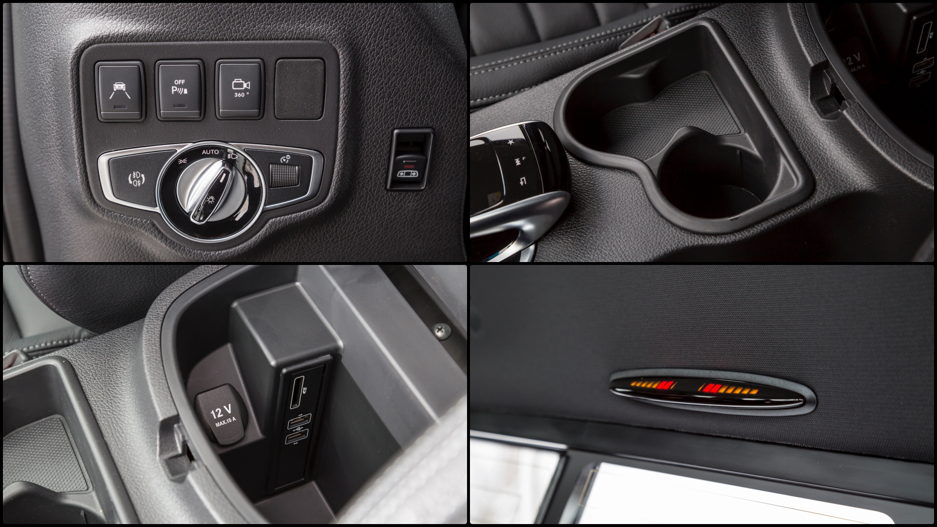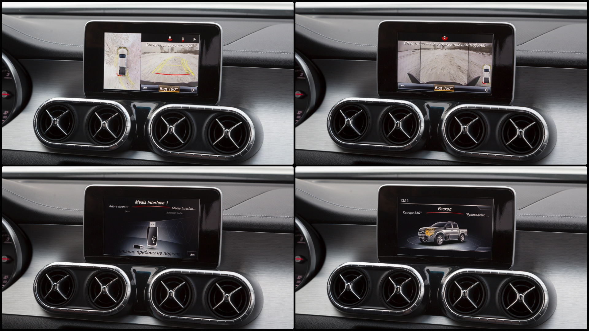 В наличии система кругового обзора с четырьмя камерами — спереди, сзади и в боковых зеркалах. Картинку они, кстати, выдают очень достойную, мерседесовскую.