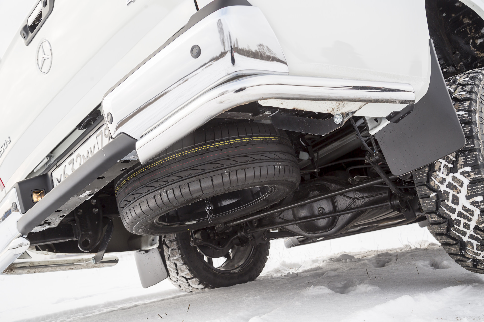 Рама лестничного типа, жесткий мост сзади, постоянный полный привод 4Matic, по умолчанию распределяющий тягу между осями в соотношении 40:60, понижающая передача, 100-процентная блокировка межосевого дифференциала и доступная опционально блокировка заднего. Зверь же!