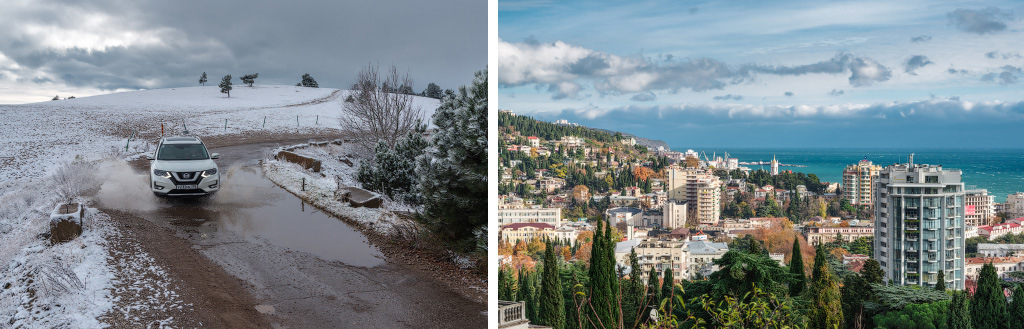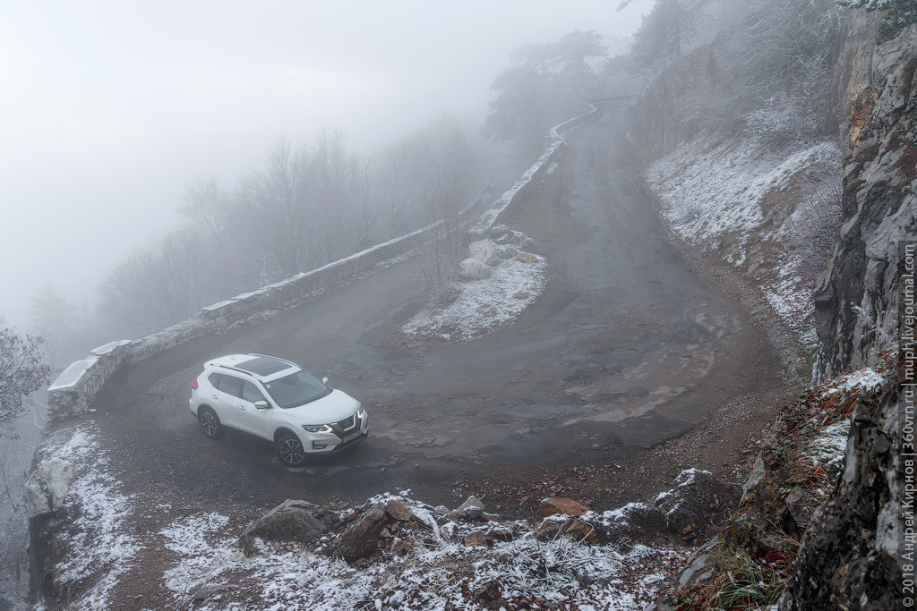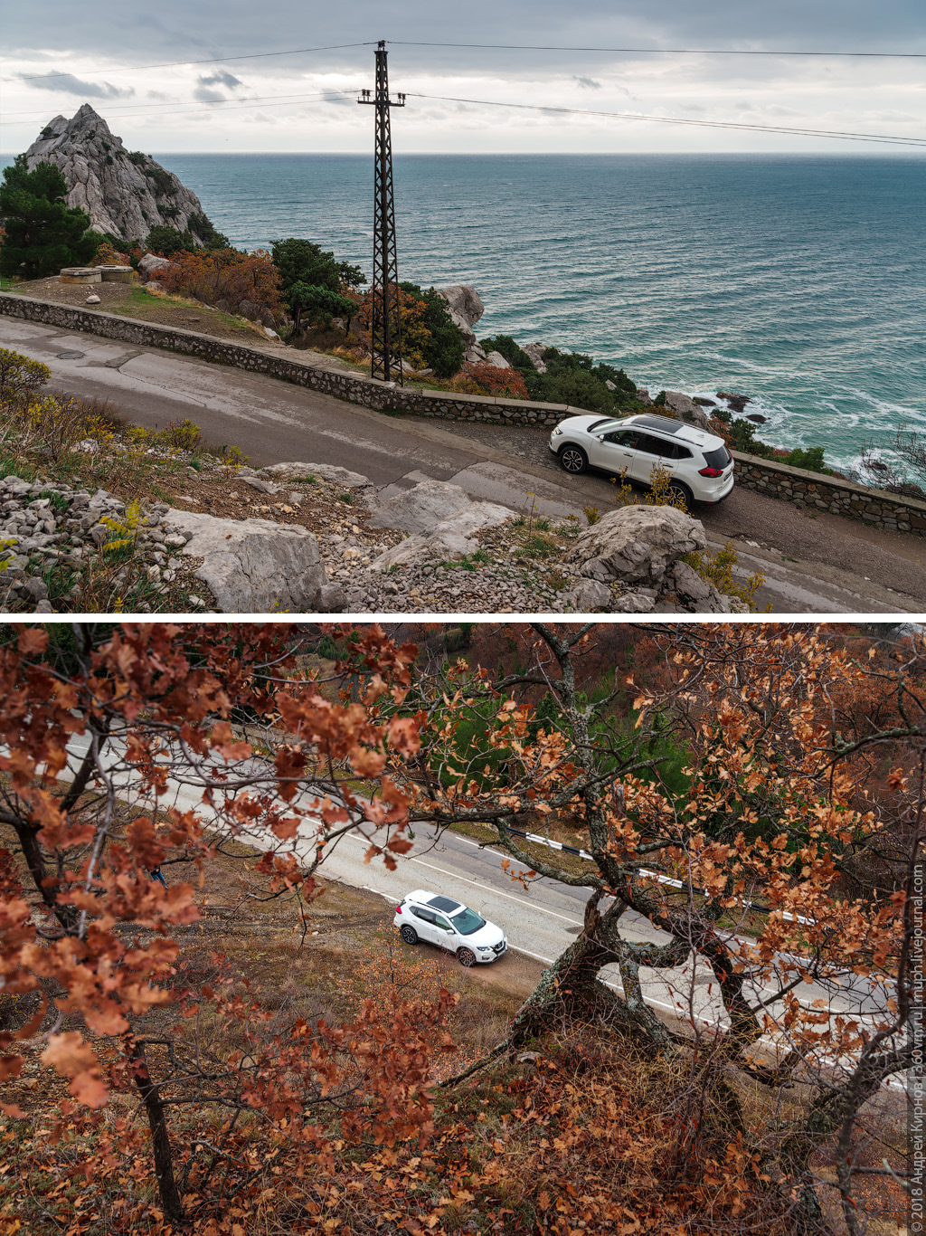 И да. Официальным поводом для моего очередного визита в Крым стало обновление третьего поколения Nissan X-Trail T32. А если быть точнее, его двухдневный тест-драйв. До этого я бывал здесь пару раз летом и один раз зимой. Это было в январе 2016 года, когда в Крыму отключали электричество, но тем не менее, мне удалось увидеть занесенные снегом пальмы, что бывает на ЮБК довольно редко, а так же поснимать бушующее зимнее море. Ну а почему бы теперь не взглянуть на Крым в его осенней ипостаси?