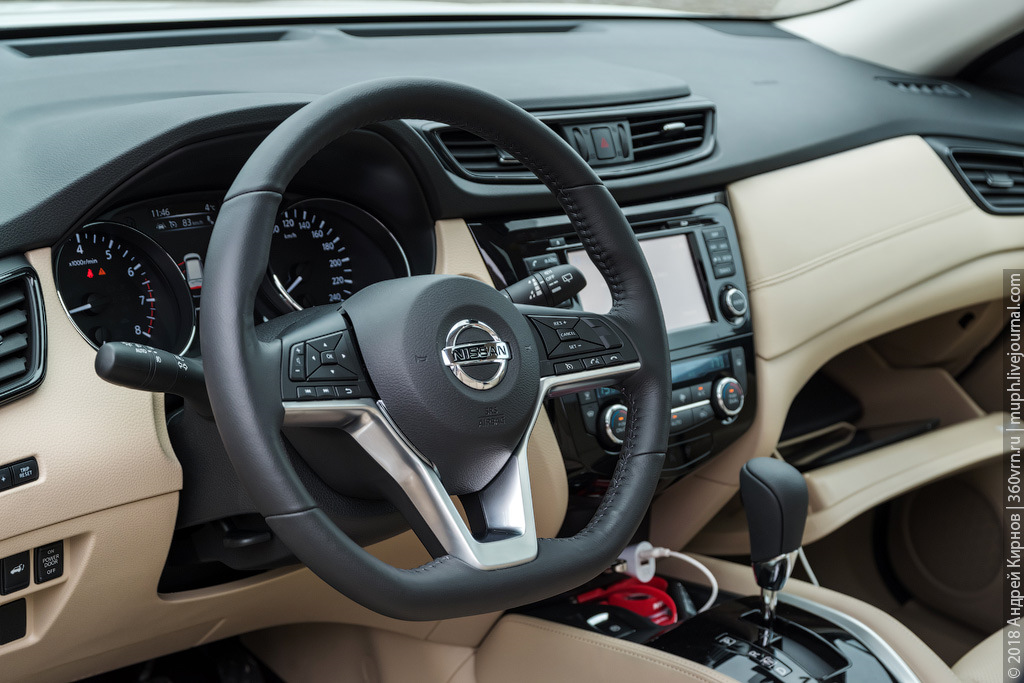 Но вернемся к нашему белому Икстрейлу и заглянем ему под капот. Здесь у нас стоит бензиновый двигатель объем 2,5 литра и мощностью 171 л.с. Кроме того, доступны еще один бензиновый двухлитровый двигатель мощностью 144 л.с, а так же дизельный — объемом 1,6 л. и мощностью 130 л.с. Бензиновые двигатели работают в паре либо с 6-ступенчатой механической КПП, либо с обновленной бесступенчатой трансмиссией Xtronic CVT, которая в новом X-Trail была перенастроена специально для российского рынка. Дизельный двигатель агрегатируется только с механической КПП. Что могу сказать по динамике разгона. Давайте признаемся сами себя, её всегда хотелось бы больше, чем имеется. На любом автомобиле. И на Икстрейле тоже. Дело привычки и манеры вождения. Мне, в целом, хватало. Тем более, что условия тест-драйва особенно и не позволяли лихачить. Да и не за этим я приехал, в общем-то.
