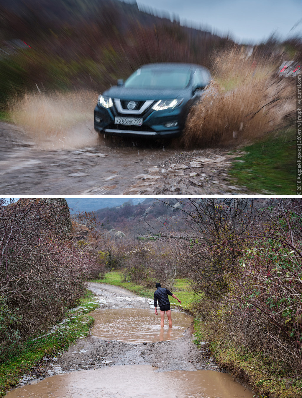Еще летом 2017 года в одном из моих фототуров был парень на Икстрейле третьего поколения я обратил внимание, что, в отличие от большинства автомобилей, при интенсивном проезде водных преград, этот автомобиль чудесным образом не заливает водой собственное лобовое стекло. В этот раз я убедился, что это действительно так. Видимость у водителя сохраняется, а водные потоки отводятся в сторону. Однако всем будущим владельцам Nissan X-Trail настоятельно рекомендую дополнительно закрепить рамки номерных знаков. Иначе может быть грустно и холодно.