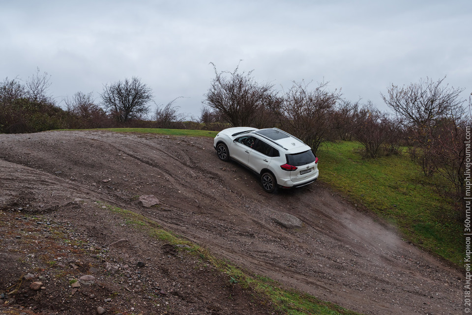Вот вам горка там же рядом с "лужайкой". И в сырую погоду, каковой она и была, на моноприводе вы туда не заедете. Ибо там еще и вывешивается одно колесо.