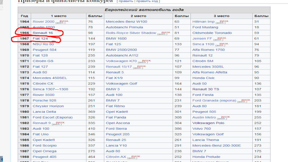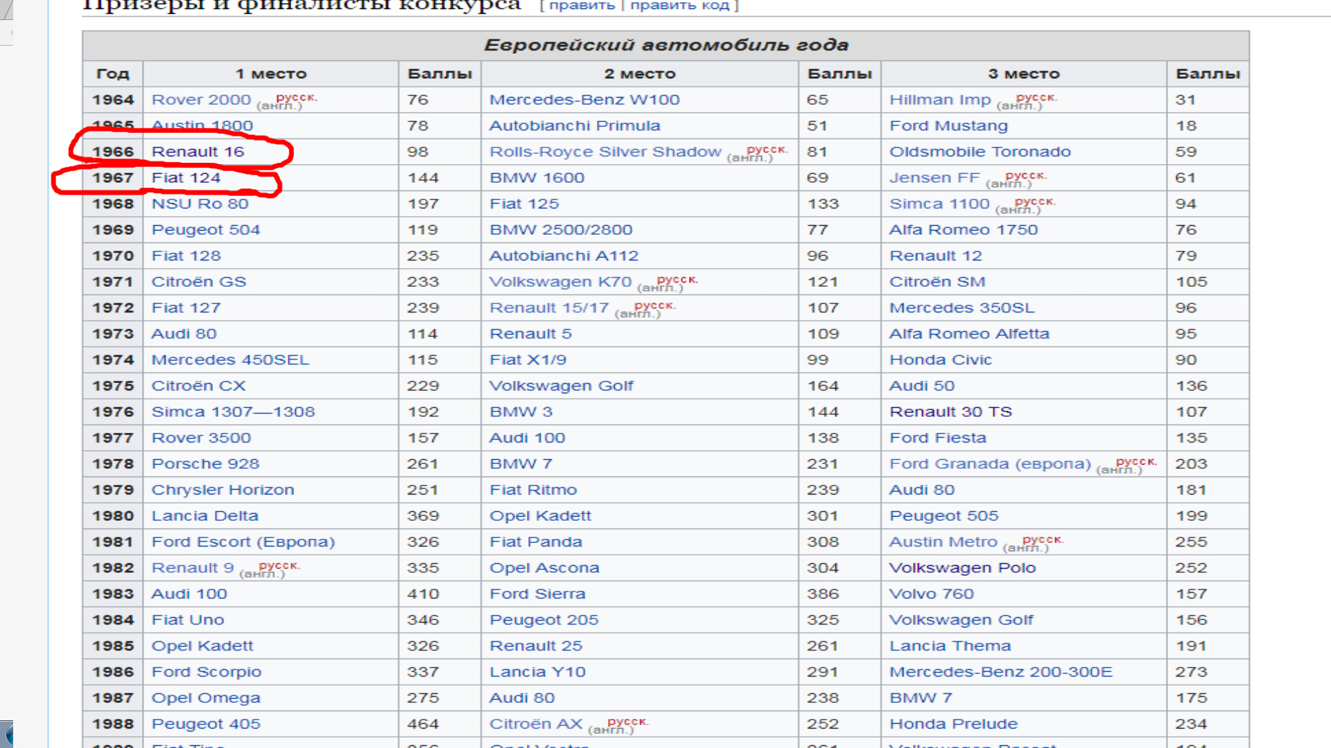 Конкурс называется европейский автомобиль года, вот если фиат 124 занял в 1967 году на нём первое место, значит ли что он был лучшим? Ну если первое место взял, то наверное да. В 1967 году он был лучшим. А вот в 1966 году первое место взял рено 16, это тот который современнее, который вместе с фиатом испытания проходил. Интересно как это современный рено взял первое место в 1966, а устаревший фиат в 1967? И в чём фиат был устаревший, в том что привод задний? И кузов седан?
