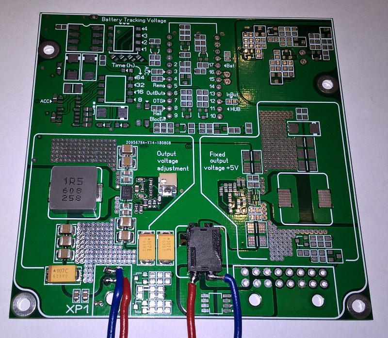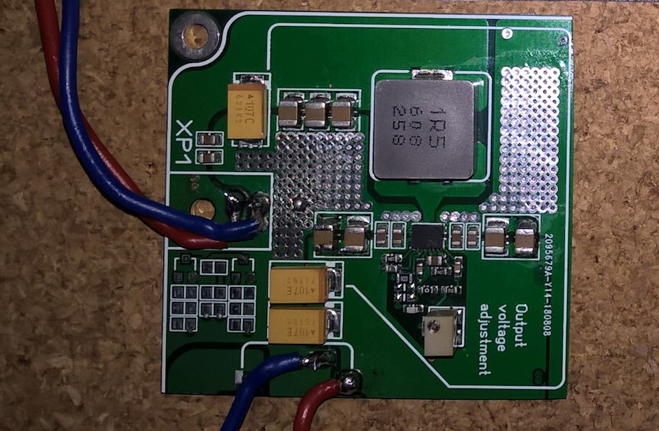 Когда DC-DC преобразователь включён и нет нагрузки на выходе, то собственное потребление 692µA . Для режима "сон" — то, что нужно! При выставленном напряжении на выходе в 5,25В стабильно работает с нагрузкой 8,6А. При такой нагрузке держит "просадку" по напряжению на входе 8,2В. При нагрузке в 6,3А "просадка" уже возможна до 7,3В. При нагрузке в 8,6А температура на корпусе микросхемы 96С, но плата вокруг имеет температуру 47С. В таком режиме "гонял" модуль примерно 4 часа. Параметры температуры не менялись. Пульсации на выходе при максимальной нагрузке составляют 80mV. Частота переключения выставлена примерно на уровне 750-800kHz. Работа модуля под полной нагрузкой 10А (примерно по времени 7 часов): температура на корпусе микросхемы 130С, температура рядом на плате на линии индуктора — 89С, индуктор — 72С, участки платы, прилегающие к микре и работающие как теплоотвод — 57С. Загнать в режим отключения по перегреву (150С) на такой нагрузке не удалось. При наличии ребристого радиатора 50х30х13мм на противоположной стороне платы приклеенного на теплопроводящий скотч 3М 0.25 мм при максимальной нагрузке в 9А температурные режимы следующие: на корпусе микросхемы 67С, плата вокруг микросхемы 29С, на радиаторе — 45С. Время теста 8 часов. Испытания отдельного модуля проходят уже достаточно долго и могу сказать, что всё работает отлично. Сейчас готовлю новый модульный блок питания на базе этой микросхемы для использования в машине для требовательных систем с током нагрузки выше 3А. Предположительные размеры блока будут 90 х 50 х 30 мм. Это будет полноценный БП с двумя каналами питания линий +/-5В (один с током до 10А, второй с током до 3А), канал с коммутируемым напряжением как на АКБ машины с током до 3А, с отслеживанием напряжения на АКБ и полным обесточиванием блока при снижении напряжения до порога в 11.5В, защита от "просадки" напряжения во время кручения стартера… Думаю, что уже к февралю первые подобные блоки уже появятся.