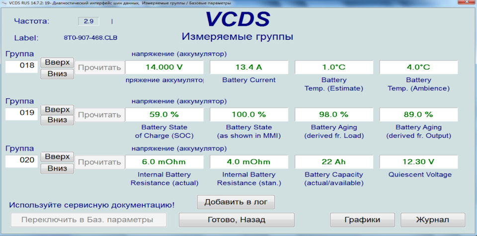 Использую VCDS — пробую в 19 блоке смотреть измеряемые величины. Именно по аккумулятору. 018, 019, 020. День за днем, в разное время, собираю статистику и пытаюсь понять. Особо внимание на 020 — значение Battery Capacity — тут объем аккумулятора в ампер часах. Важное значение. Потому как оно, похоже, и влияет на формулу по которой показывается состояние батареи в MMI.