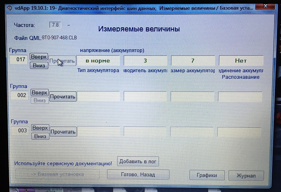 Чтобы проверить прописали вы АКБ или нет нужно зайти в 19-й блок, далее => Измеряемые величины => и вводим 17-ю группу и смотрим —