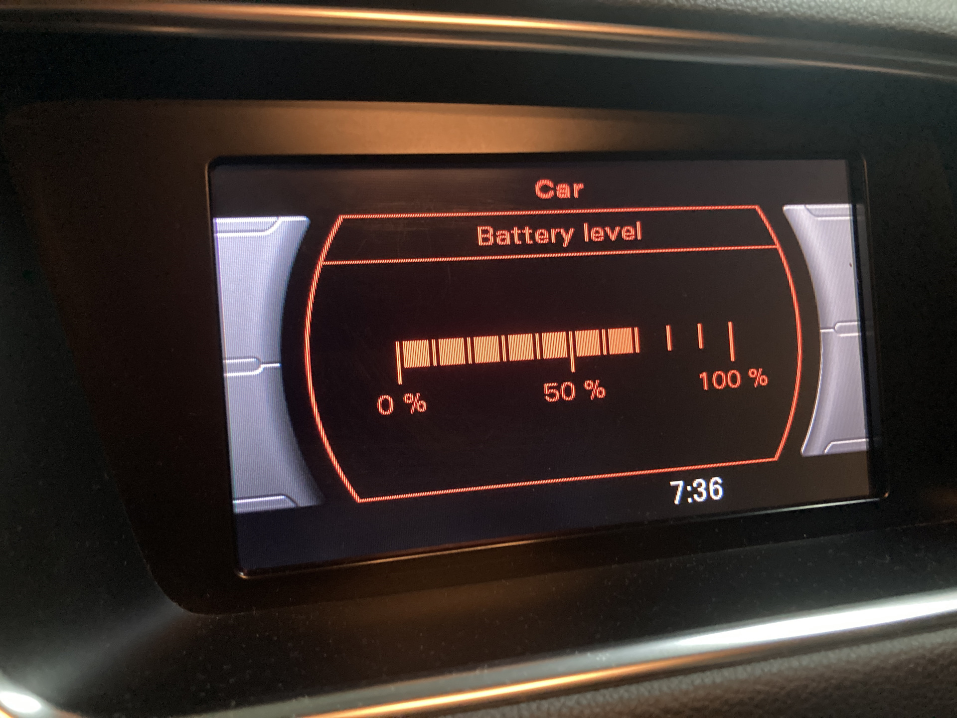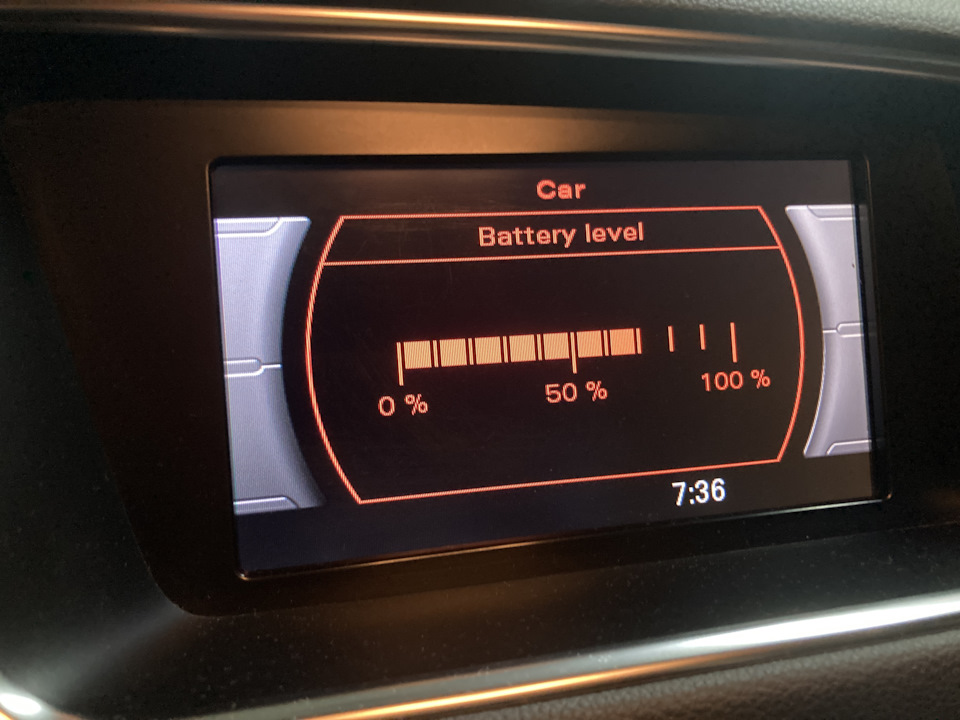 Зимой высаживался аккумулятор. Не всегда. Но такое происходило. И это напрягало. Но, вроде, бывает такое зимой. Однако, проблема усложнялась и тем, что он и весной, летом и осенью мог высаживаться. Не так часто, но такое бывало. Через VAG-COM включил видимость зарядки аккумулятора в MMI. Мог наблюдать факт, но ничего сделать не получалось. Вечером ухожу и аккумулятор заряжен на 100%, утром прихожу, а зарядка 50%, или 30% или 10%. Иногда просто в ноль и автомобиль вообще не заводился.