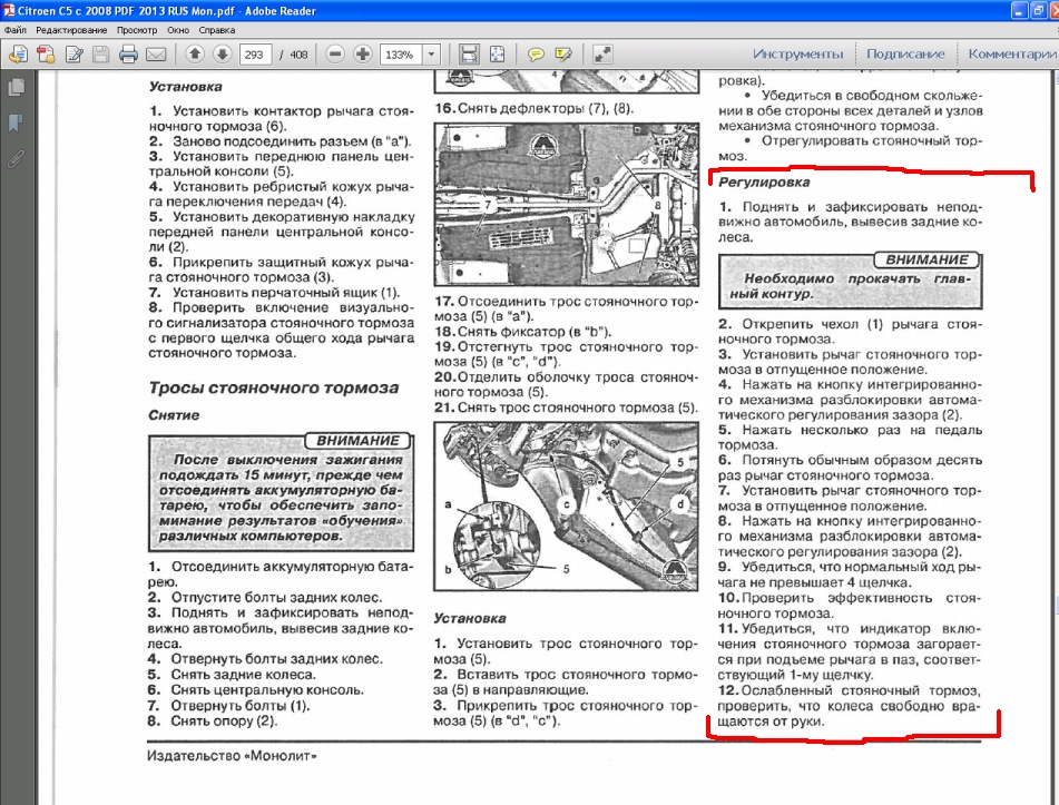 Как подтянуть ручник выкладываю фото из мануала и опишу своими словами на всякий случай.