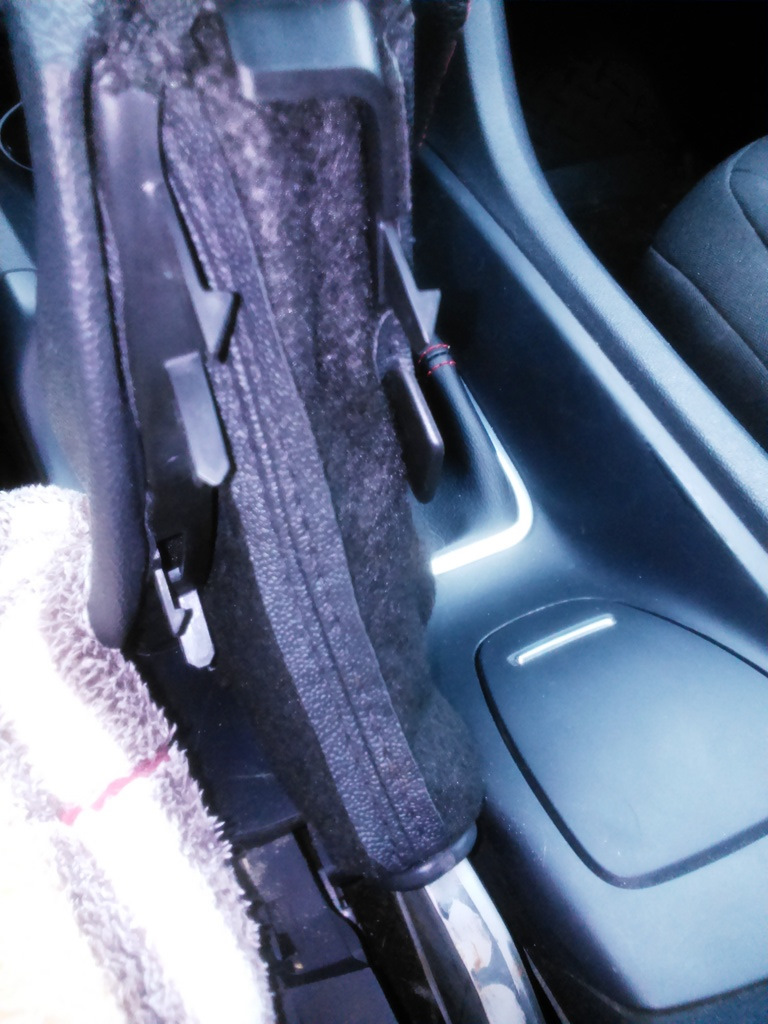 Главная проблема возникла как снять чехол ручника нижняя часть, одни пишут просто сдергивается, другие пишут с внутренней стороны прижат винтами разбирай подлокотник что делать очень не хотелось, подергал в разные стороны сидит плотно долго туда никто не лазил, чехол старый хотел резать, заметил что взяв со стороны водительского сидения за чехол и потянув с усилием в верх раздаются щелчки, дернул еще сильнее он и вышел фото креплений выкладываю.