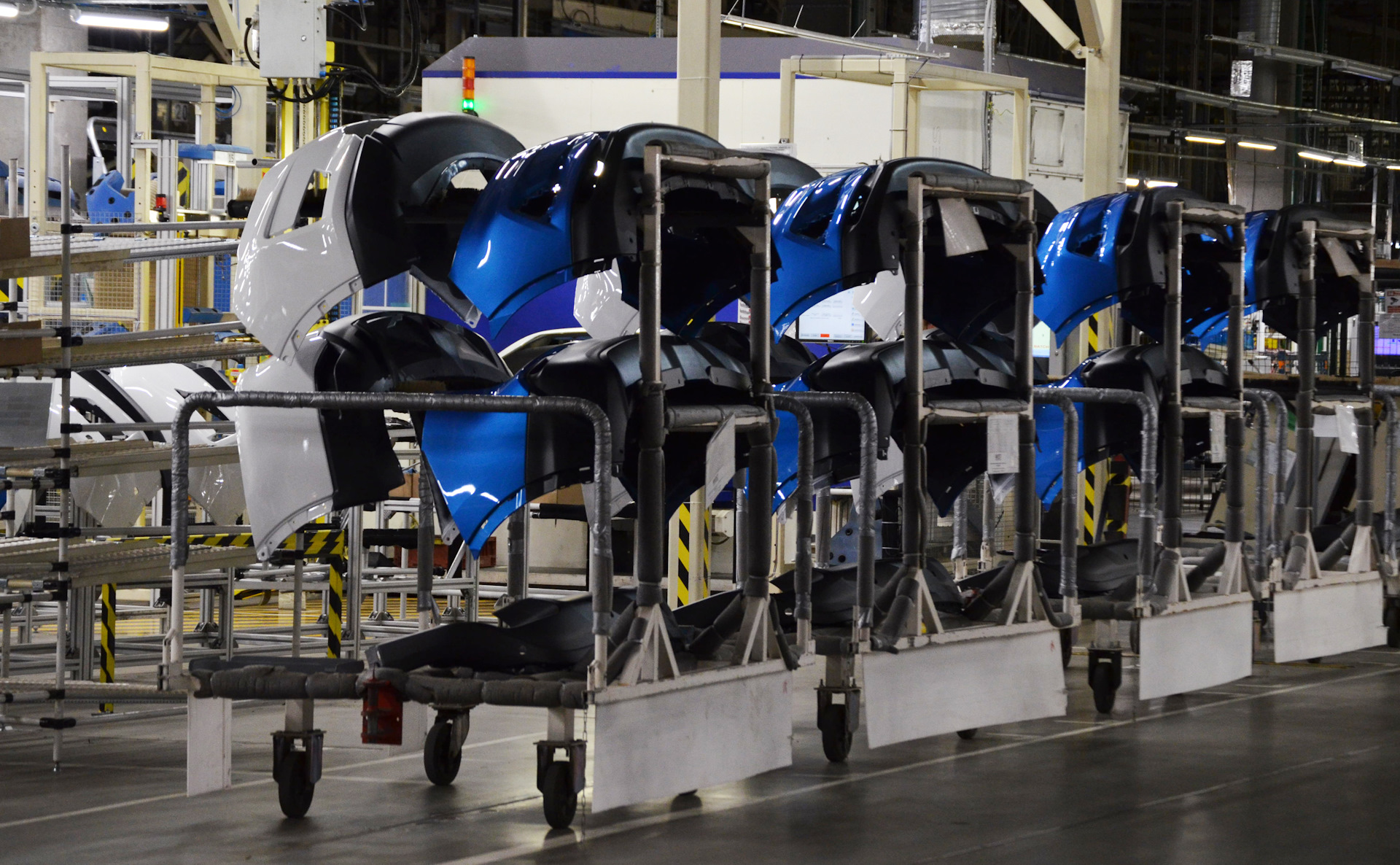Отдельным путем по цеху идут бамперы, которые также производятся здесь, на заводе, – после подготовки 4 робота наносят на них грунт, базу и лак, затем их высушивают в печи при температуре 95 градусов. После этого каждый бампер осматривается на станции инспекции и полировки.