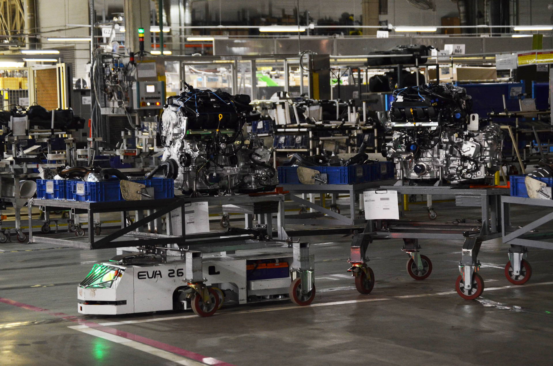 Его длина — более 500 метров, он проходит через половину цеха сборки и пересекается с пятью из семи производственными участками основной линии сборки. Интересно, что этот проект придумали и внедрили сотрудники завода. По их словам, самой большой сложностью в работе над проектом был… масштаб и момент учета множество нюансов, которые влияют как на текущие производственные процессы.
