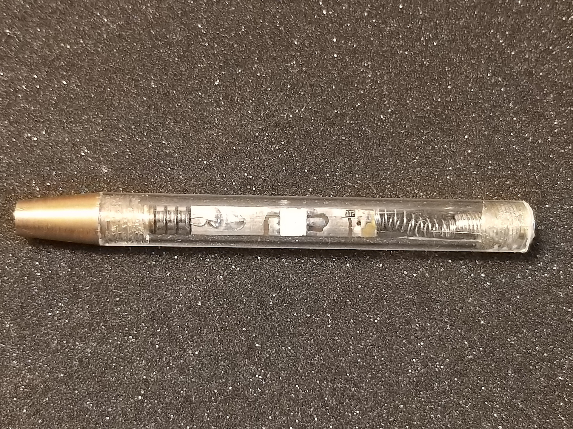 Вся начинка контрольки расположена в корпусе из прозрачного оргстекла. Сквозь оргстекло хорошо видно из чего состоит контролька: батарейки, печатная плата, на которой припаян светодиод и пружинка, для надёжного контакта компонентов контрольки. Размеры корпуса один сантиметр в диаметре и 8 сантиметров в длину. Корпус негерметичный, неразборный.