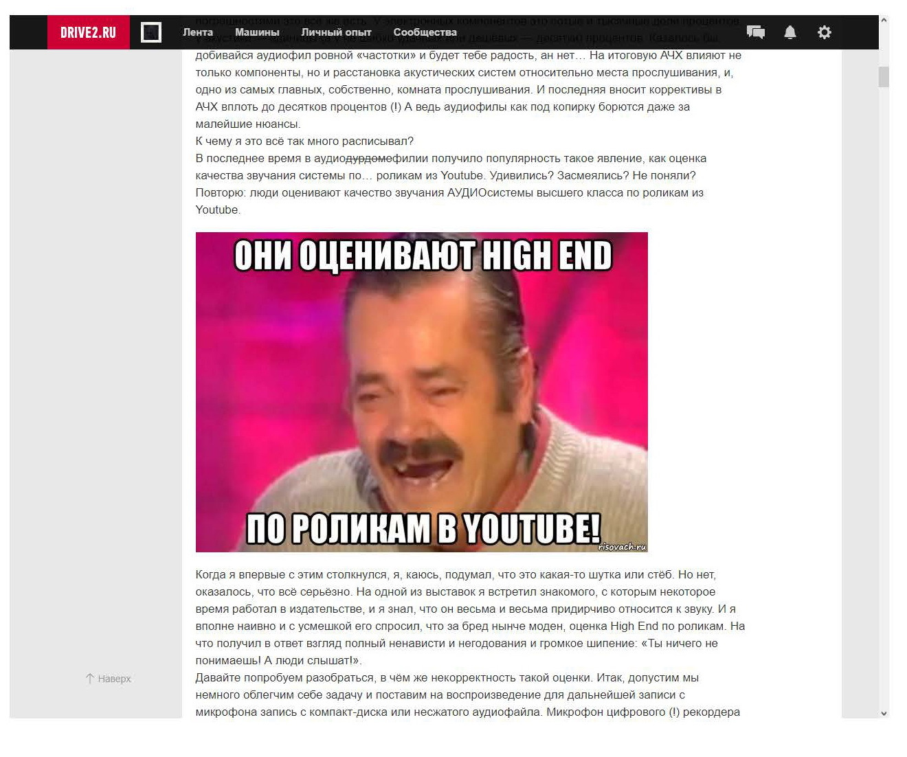 А теперь скажите: объективная ли будет оценка при стольких изменениях? Может ли это оправдать фраза «Люди слышат»? По-моему, нет. Это чистой воды сумасшествие. Аудиосистемы можно и нужно оценивать всего двумя методами, которые не заменяют друг друга, а дополняют: инструментальный контроль и прослушивание в подготовленной комнате прослушивания с минимальными внесениями в звук. Поэтому если аудиофил на полном серьёзе рассуждает о звучании той или иной системы или компонента, даже если вскользь упоминает про ролик на Youtube, можете рассмеяться ему в лицо: он просто банальный позёр, коему грош цена. И ведь после такого фраза «Сосед напел» становится куда более интересной и полновесной…