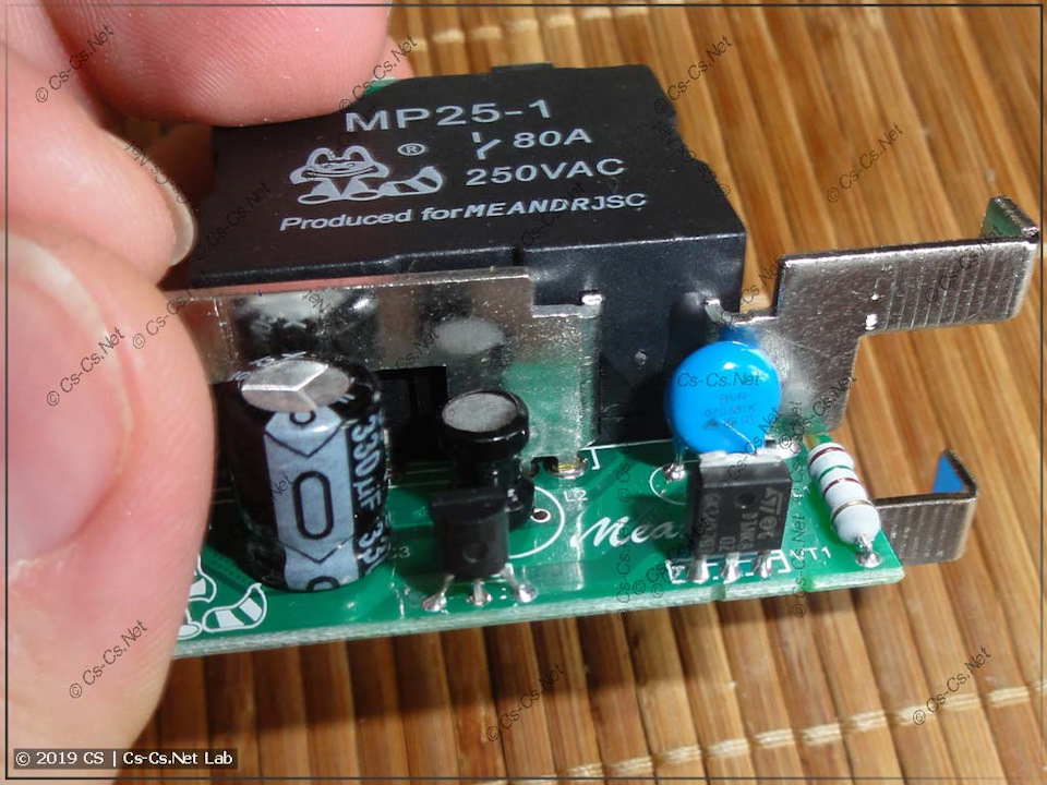 Силовое реле осталось таким же, как и много лет назад. Всё без изменений, и реле на 80А. Обычно китайцы выпускают такие реле с гибкими выводами, а Меандр заказывает для себя реле с жёсткими выводами. Снизу находится блок питания, схема которого не менялась (визуально) с обзора УЗМок от Ksiman’а: два транзистора и стабилизатор.