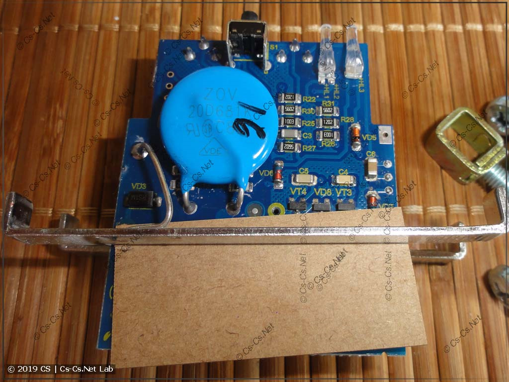А теперь — забавное. Чтобы контакт нуля не коротил с платой, они прокладывают внутрь кусочек электрокартона для изоляции. В будущей модификации УЗМки (у которой светодиоды снизу) они от этого картона избавились.