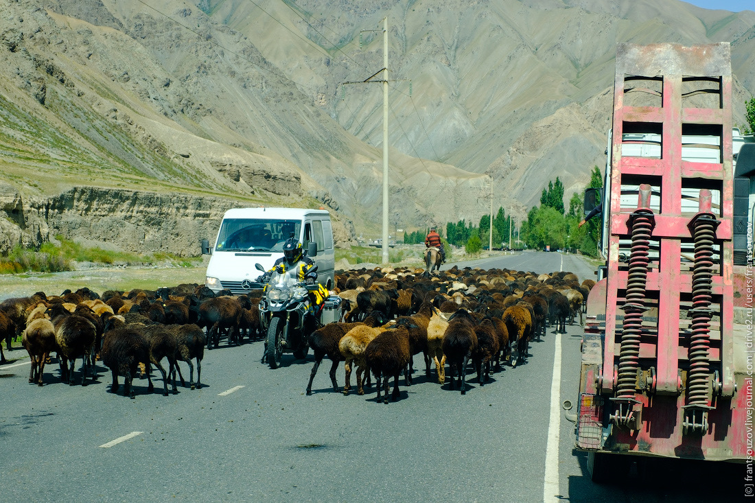 5. Несмотря на конец августа, лето в горах уже закончилось и началась осень, пастухи погнали скот вниз. Когда стадо идёт навстречу, то можно просто остановиться и подождать, пока толпа животных обойдёт машину вокруг. А вот когда движение попутное, то "протиснуться" вперёд бывает очень непросто. Хотя на экспедиционном мотоцикле это всяко легче, чем на вседорожном кемпере или грузовике.