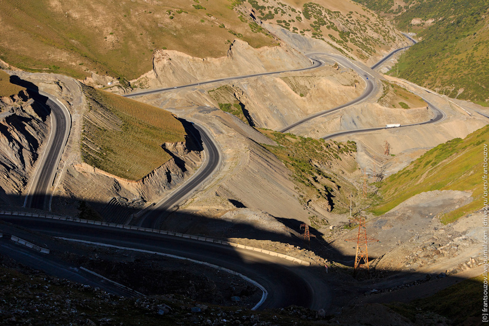 4. Но топливо нам уже не нужно, а раз так, то решаем стартовать в Ош. Вид с перевала Талдык высотой 3615 метров. Хотели бы прокатиться на такой дороге на чём-нибудь мощном, да с хорошими тормозами? Мы бы тоже хотели, но сейчас приходится спускаться на второй-третьей передаче со скоростью около 40 километров в час, натужно рыча дизелем, потому что перегреть тормоза трёхтонного микроавтобуса на таком спуске — раз плюнуть.
