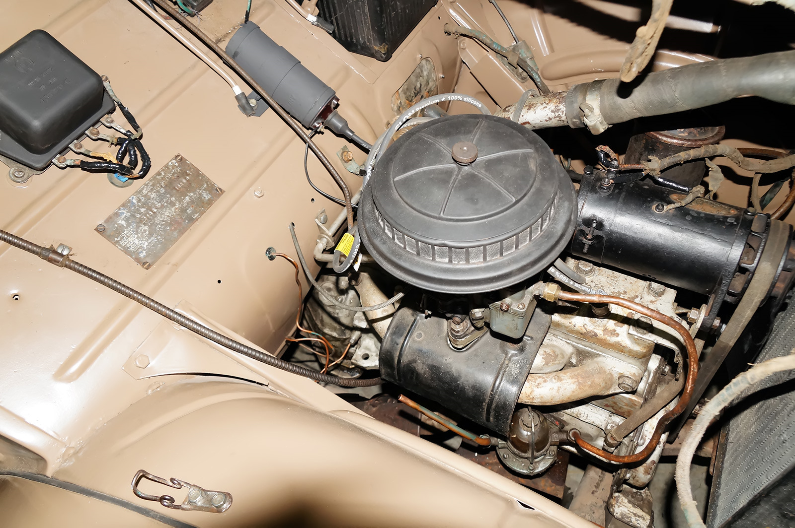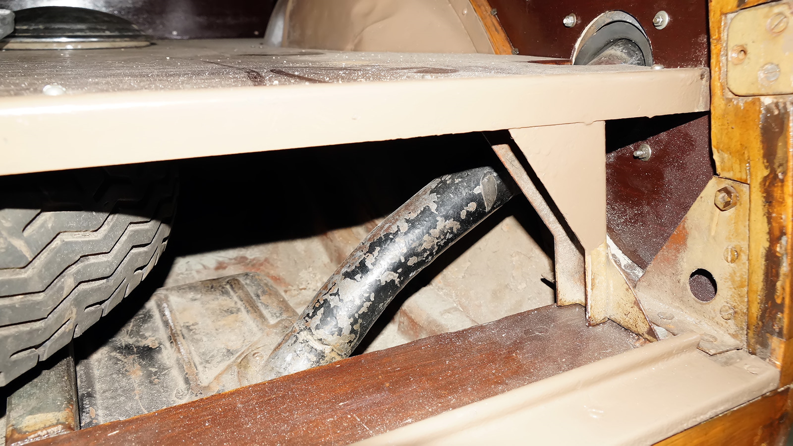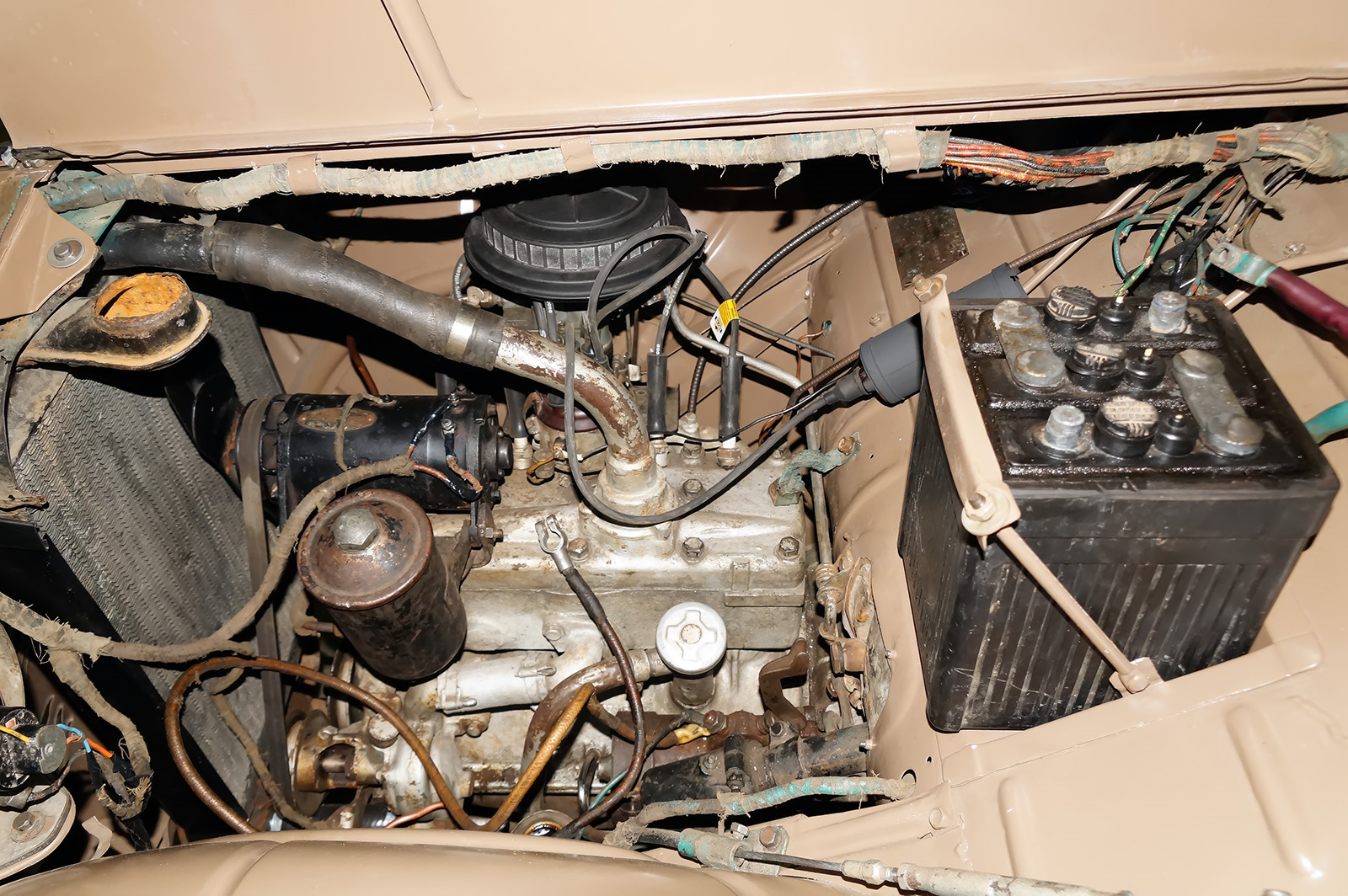 Согласен, качество реставрации слабовато. Лично у меня создалось впечатление что данный экземпляр просто сохранился в неплохом виде. Дерево почти везде родное. Следы старого ремонта в металле хорошо просматриваются . Двигатель судя по всему просто помыли но не разбирали . Патрубок от помпы окрашен серебрянкой прямо по резине вместе с хомутами видимо еще в далекие годы. Хорошо просматриваются и места древнего ремонта по жести, но если это недавние попытки то больше и сказать нечего. Машина как мне кажется достойна к себе более серьезной углубленной работы.
