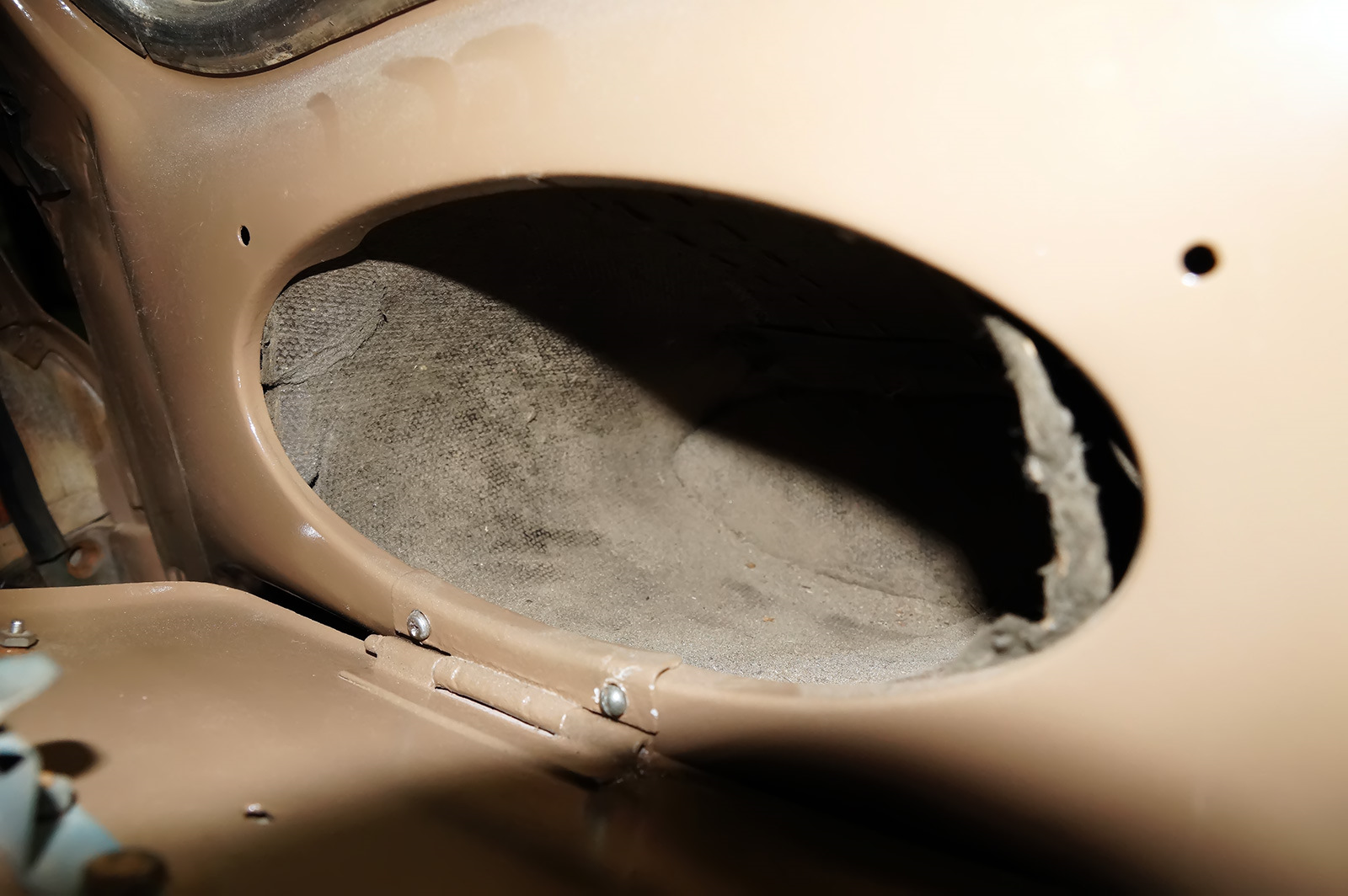 Изнутри же крыша деревянного "Москвича" представляет собой каркас из продольных и поперечных реек. Между внешним слоем "автобима" и каркасом проложен слой мягкой и светлой ткани, похожей на старое советское одеяло — наверняка у вашей бабушки было такое же