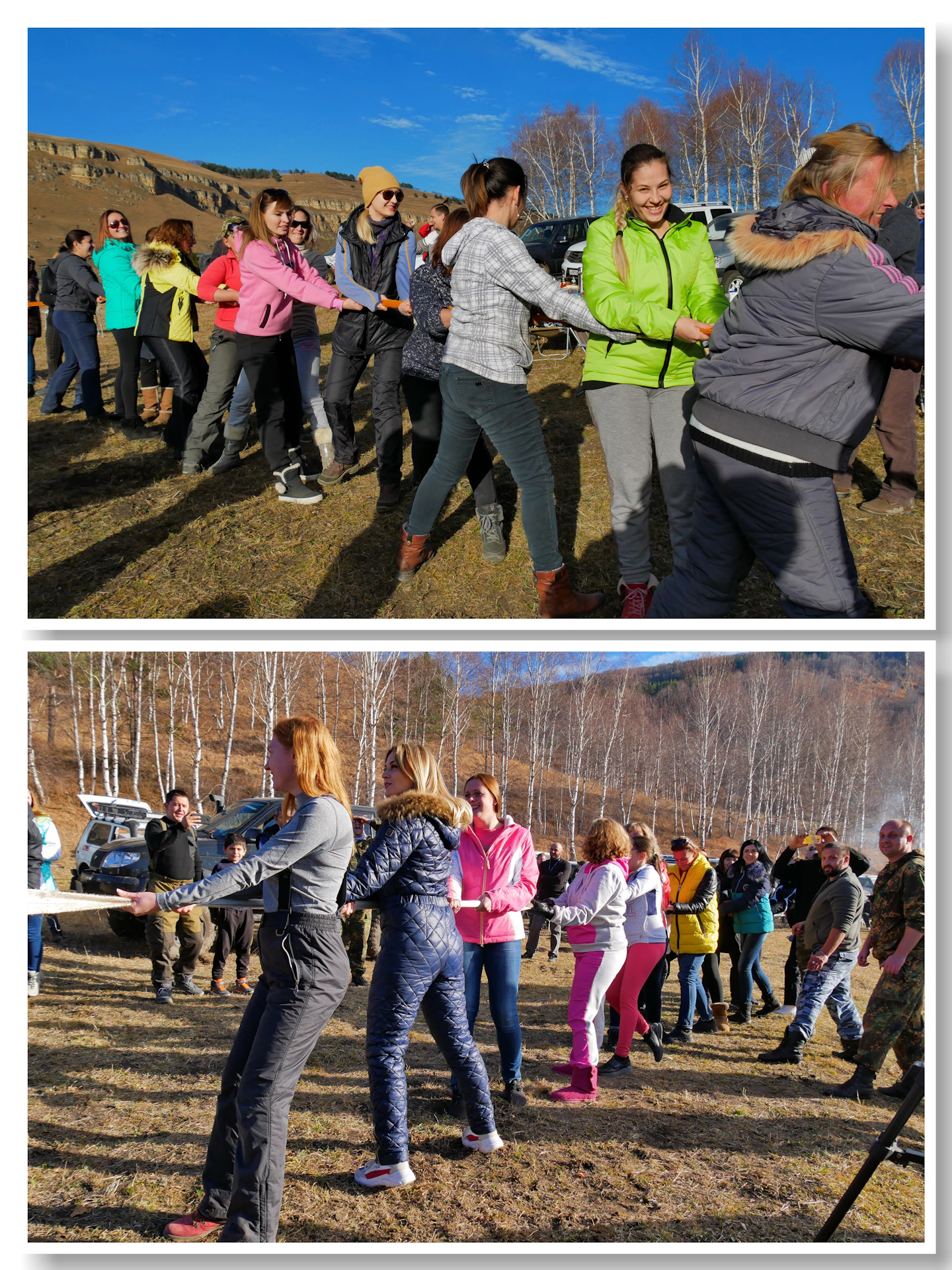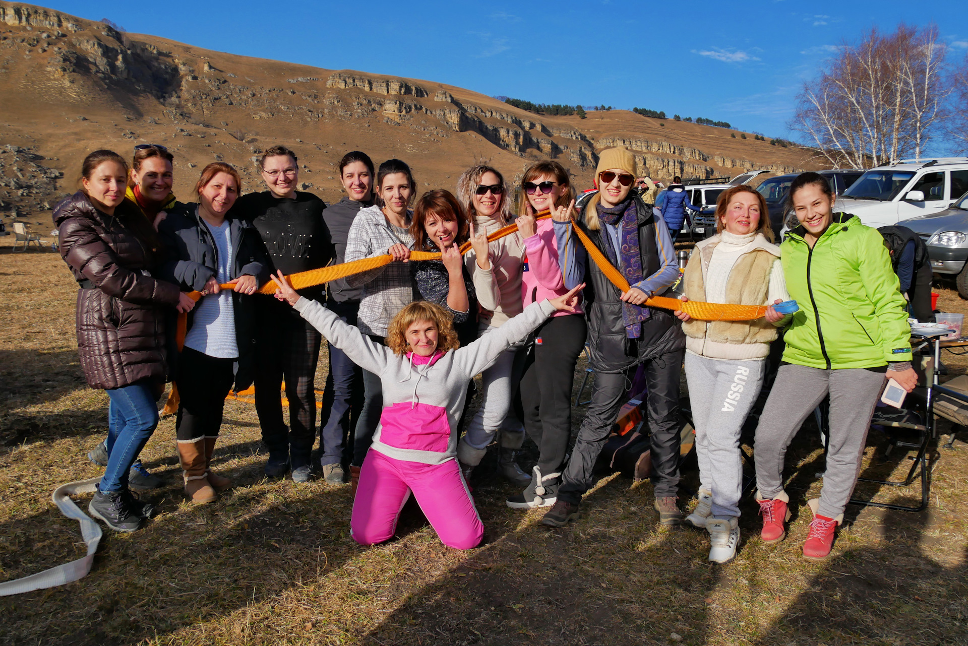 20. Не обошлось и без весёлых силовых упражнений, два скрепленных между собой рывковых троса, отлично заменяют один канат.21. А наши девчонки доказали, что они настоящие боевые подруги!22. Неподдельная радость победительниц состязания и фото на память!23. Ну и чтобы не проводить весь день у стола, все желающие могли отправиться на экскурсию к Золотым водопадам. Это скорее не водопады, а пороги, но зато под водой не глина, а плотный камень. Летом в солнечных лучах он светится ярким жёлтым цветом, вероятно, поэтому водопады и получили такое название.