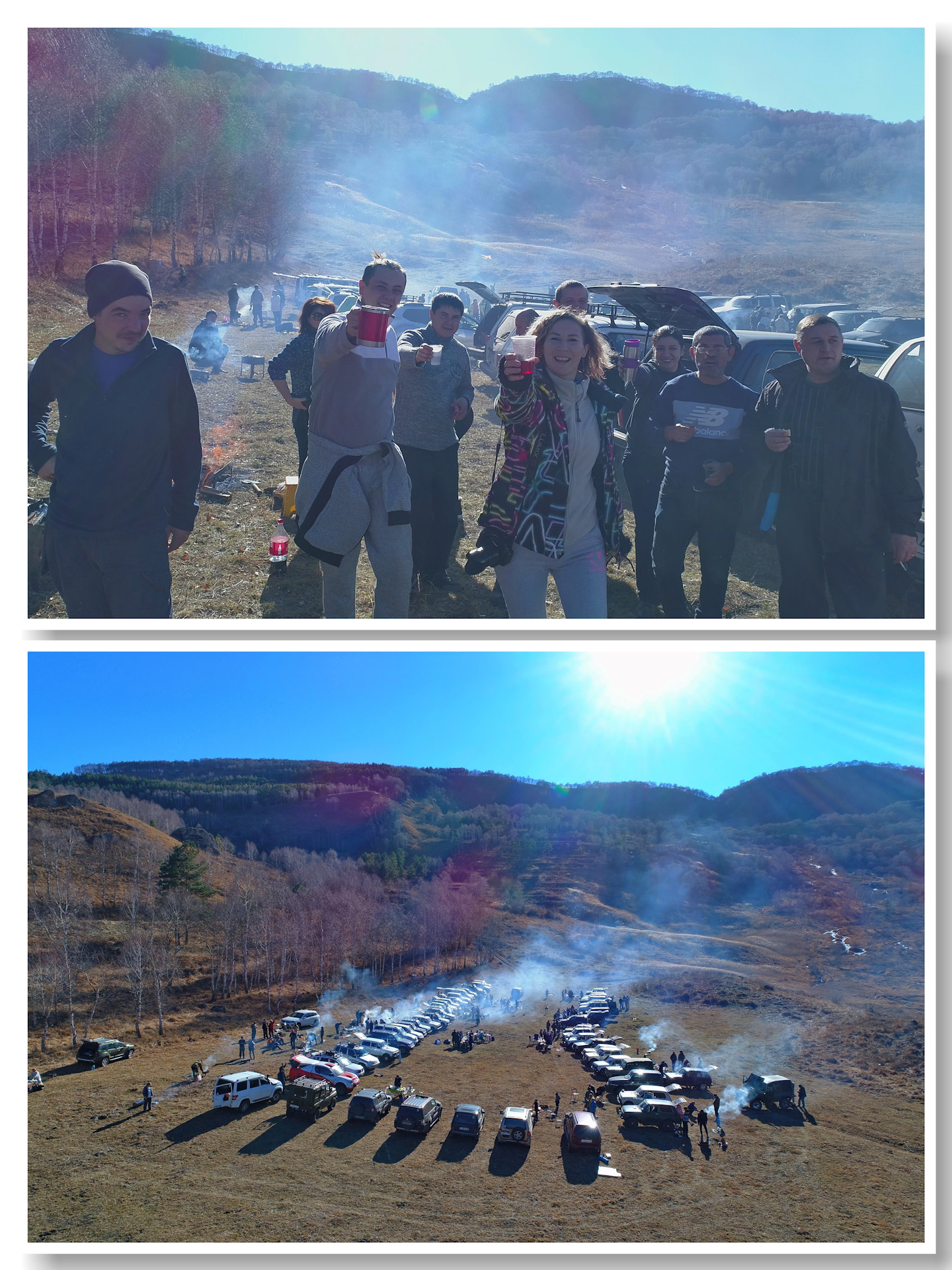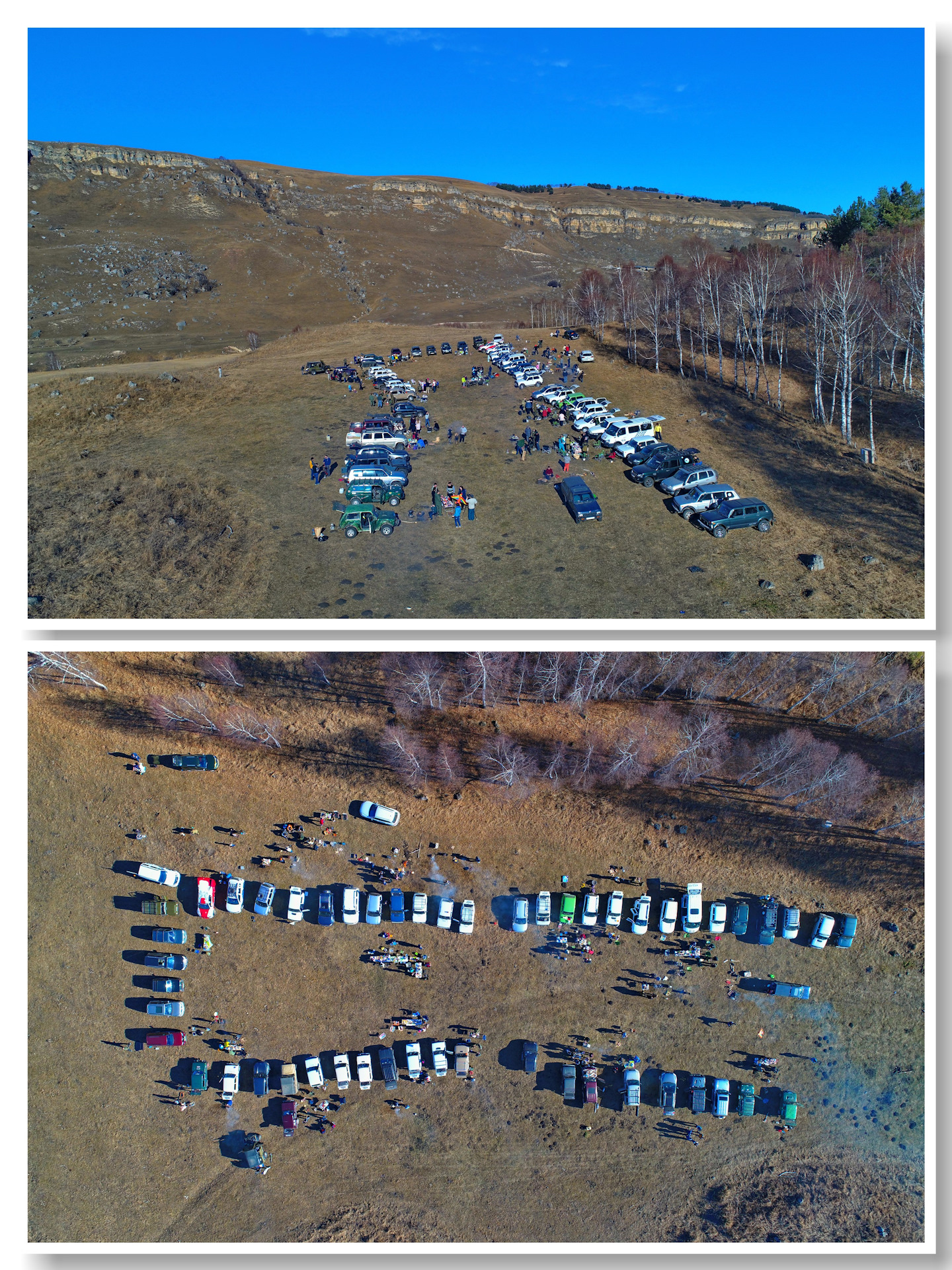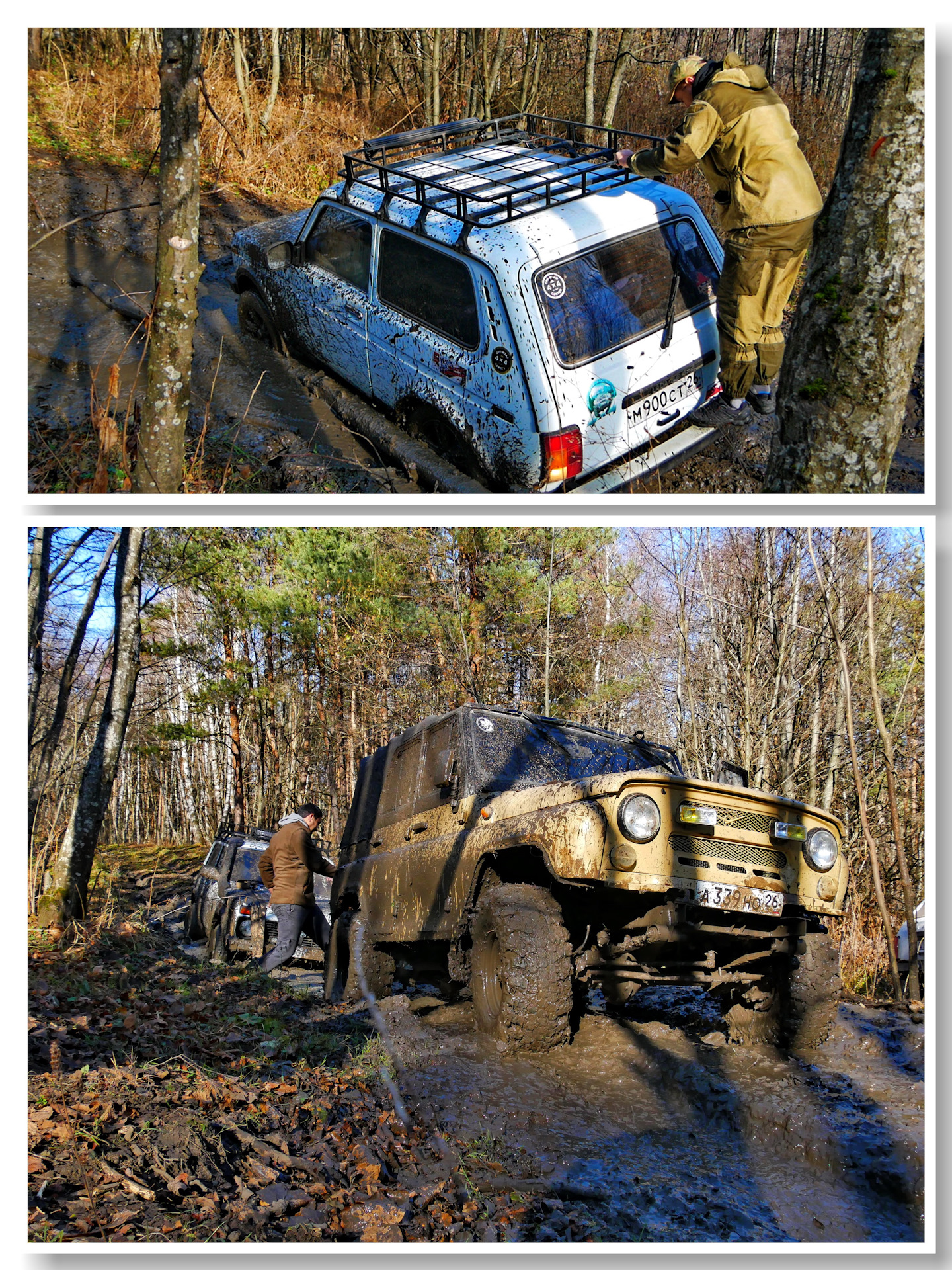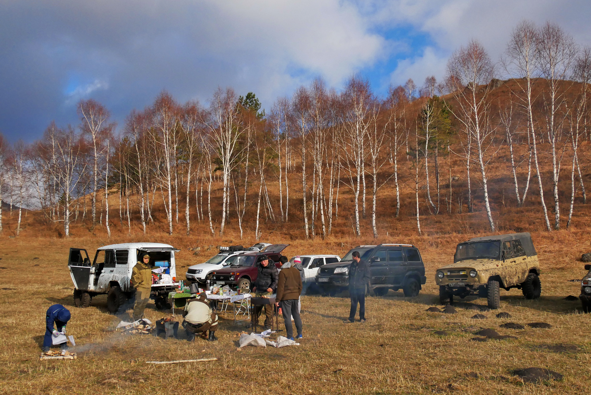 2. И сразу с места в карьер в прямом смысле! Первый вариант поляны был совсем близко, пока покатушники проводили рекогносцировку местности, я, пользуясь моментом, поднял в воздух свой коптер. В одной из машин был пёс породы Джек Рассел терьер, он полный энтузиазма тут же согнал с места табун пасущихся лошадей, пока коптер бы в воздухе и я был просто обязан воспользоваться моментом и снять красивый бег прекрасных животных (ролик есть в моём фильме в конце отчёта).3. Первая поляна показалась нам слишком кривой и мы едем дальше. Но просто ехать скучно, на пути попадается большая лужа с кучей брёвен разных размеров. Кто-то когда-то здесь застрял и таким способом пытался выехать. Но брёвна за собой естественно не убрал. Мы решили расчистить лужу немного нестандартным способом. Вначале пару раз прогнали туда-сюда двумя УАЗами на 35-х МТ-колёсах, которые прекрасно справились со своей задачей, брёвна прибрели строгое направление вдоль дороги. Затем в ход пошли нивы на 27-х колёсах, но им было значительно сложнее. Одна из нив умудрилась проскочить один раз, другая застряла сразу. В обратную сторону застряли обе.4. Ни раскачка, ни попытка вытолкать эффекта не имела. Так что снова на помощь пришли УАЗы. Сами заманили в грязь, сами и вытащили ))) Ну а пока нивы в луже пытались выбраться самостоятельно, заодно удалось вытащить все брёвна и палки, сделать доброе дело для будущих гряземеров.5. Зато теперь мы можем поделиться бесплатным лайфхаком, как быстро перекрасить белую машину в чёрный цвет ))) Ну а если результат вас не устроит, то чёрный цвет всегда можно смыть на мойке.6. Далее маршрут пролегает через довольно крутой холм, правда с высоты он почему-то смотрится слишком полого, пытаясь ввести нас в заблуждение, но мы этому эффекту не верим, так как одна из машин просто не смогла подняться на вершину и ей пришлось объезжать вокруг.7. А погода радует, погода шепчет. Такую осень я люблю. И хоть листва с деревьев уже облетела, но ярко-голубое небо и не менее яркое солнце поднимают настроение за считанные минуты.8. Во втором варианте поляна была отличная, но не понравился сильный ветер, в итоге решаем остановиться здесь.9. Все уже порядком проголодались и припасённые с собой вкусняшки, приходятся как нельзя кстати.10. Понемногу вечереет, погода портится, но дело сделано, так что можно с чистой совестью ехать домой.11. Долина, которую мы выбрали, находится в верховьях реки Берёзовка и в неё есть 2 въезда. Один, через который мы заезжали, более сложный (грязь, камни, колея), а другой с более-менее нормальной дорогой, обычно перекрыт шлагбаумом. Поэтому разведываем и этот маршрут, находим вариант объезда и выезжаем через него.12. Решив, что день надо заканчиваться красиво, по пути заезжаем на обзорную площадку с видом на Берёзовское ущелье. Вход сюда платный, но цена символическая, если не ошибаюсь 20 или 30 рублей с человека.