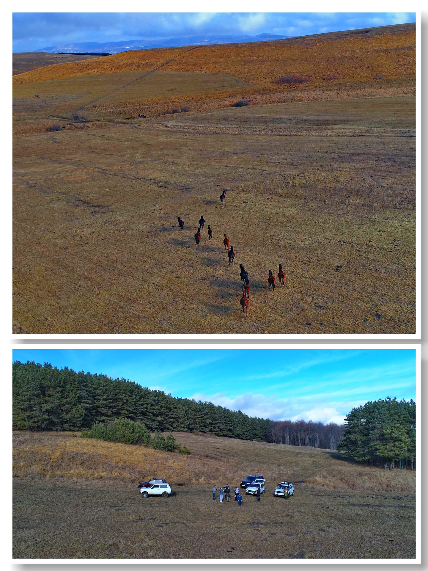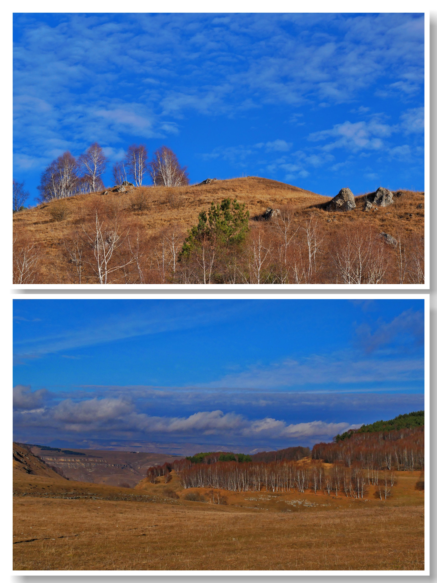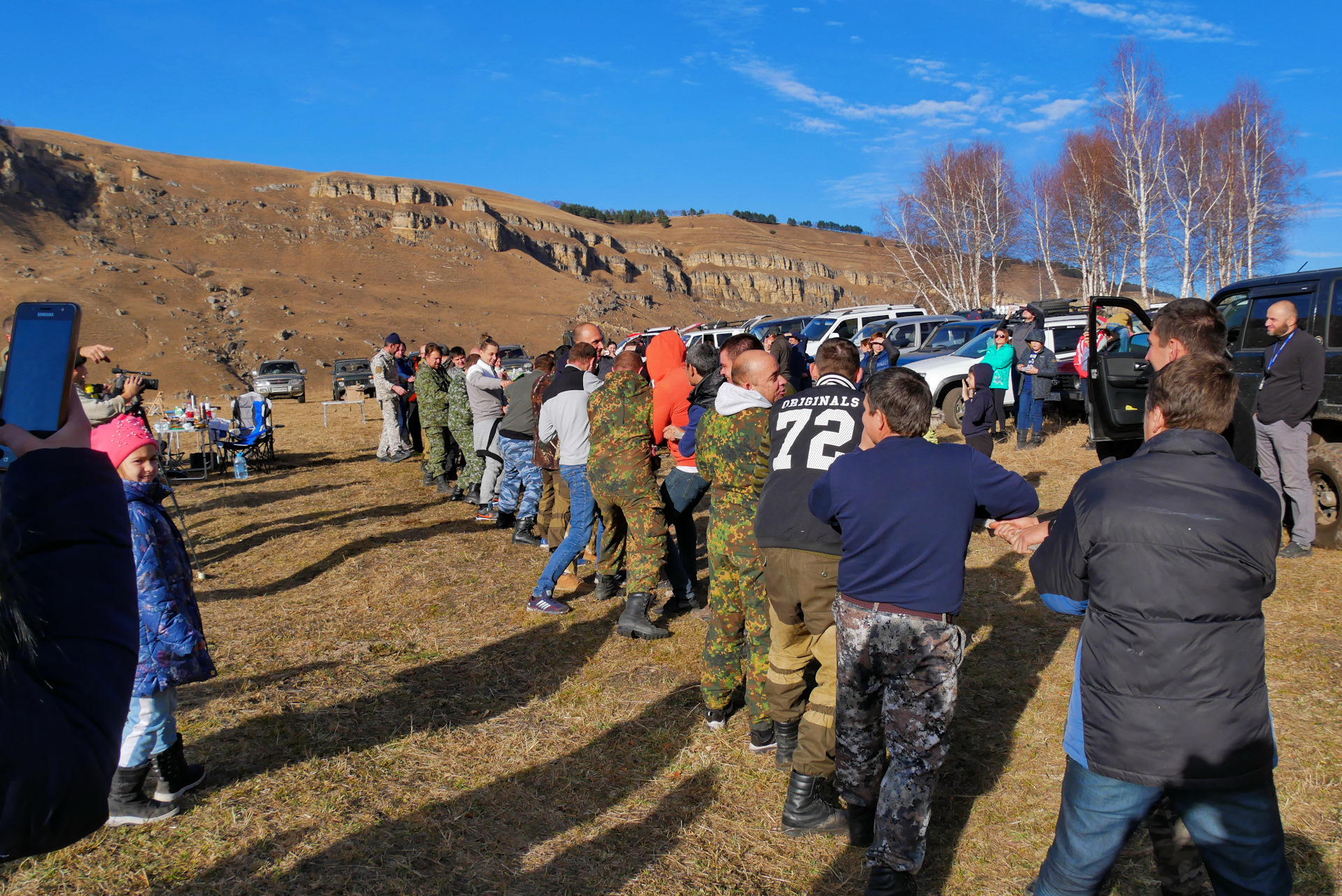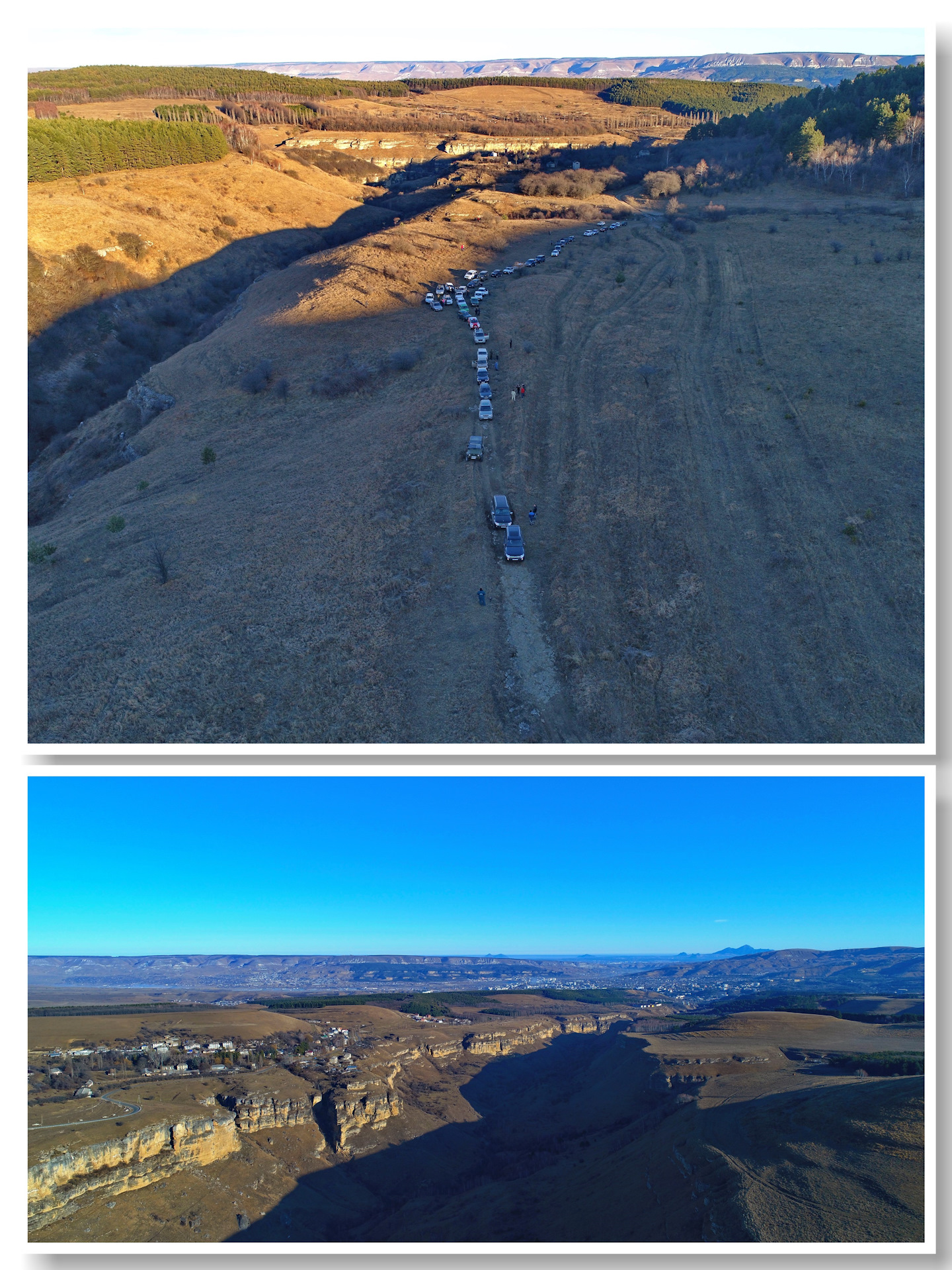 2. И сразу с места в карьер в прямом смысле! Первый вариант поляны был совсем близко, пока покатушники проводили рекогносцировку местности, я, пользуясь моментом, поднял в воздух свой коптер. В одной из машин был пёс породы Джек Рассел терьер, он полный энтузиазма тут же согнал с места табун пасущихся лошадей, пока коптер бы в воздухе и я был просто обязан воспользоваться моментом и снять красивый бег прекрасных животных (ролик есть в моём фильме в конце отчёта).3. Первая поляна показалась нам слишком кривой и мы едем дальше. Но просто ехать скучно, на пути попадается большая лужа с кучей брёвен разных размеров. Кто-то когда-то здесь застрял и таким способом пытался выехать. Но брёвна за собой естественно не убрал. Мы решили расчистить лужу немного нестандартным способом. Вначале пару раз прогнали туда-сюда двумя УАЗами на 35-х МТ-колёсах, которые прекрасно справились со своей задачей, брёвна прибрели строгое направление вдоль дороги. Затем в ход пошли нивы на 27-х колёсах, но им было значительно сложнее. Одна из нив умудрилась проскочить один раз, другая застряла сразу. В обратную сторону застряли обе.4. Ни раскачка, ни попытка вытолкать эффекта не имела. Так что снова на помощь пришли УАЗы. Сами заманили в грязь, сами и вытащили ))) Ну а пока нивы в луже пытались выбраться самостоятельно, заодно удалось вытащить все брёвна и палки, сделать доброе дело для будущих гряземеров.5. Зато теперь мы можем поделиться бесплатным лайфхаком, как быстро перекрасить белую машину в чёрный цвет ))) Ну а если результат вас не устроит, то чёрный цвет всегда можно смыть на мойке.6. Далее маршрут пролегает через довольно крутой холм, правда с высоты он почему-то смотрится слишком полого, пытаясь ввести нас в заблуждение, но мы этому эффекту не верим, так как одна из машин просто не смогла подняться на вершину и ей пришлось объезжать вокруг.7. А погода радует, погода шепчет. Такую осень я люблю. И хоть листва с деревьев уже облетела, но ярко-голубое небо и не менее яркое солнце поднимают настроение за считанные минуты.8. Во втором варианте поляна была отличная, но не понравился сильный ветер, в итоге решаем остановиться здесь.9. Все уже порядком проголодались и припасённые с собой вкусняшки, приходятся как нельзя кстати.10. Понемногу вечереет, погода портится, но дело сделано, так что можно с чистой совестью ехать домой.11. Долина, которую мы выбрали, находится в верховьях реки Берёзовка и в неё есть 2 въезда. Один, через который мы заезжали, более сложный (грязь, камни, колея), а другой с более-менее нормальной дорогой, обычно перекрыт шлагбаумом. Поэтому разведываем и этот маршрут, находим вариант объезда и выезжаем через него.12. Решив, что день надо заканчиваться красиво, по пути заезжаем на обзорную площадку с видом на Берёзовское ущелье. Вход сюда платный, но цена символическая, если не ошибаюсь 20 или 30 рублей с человека.