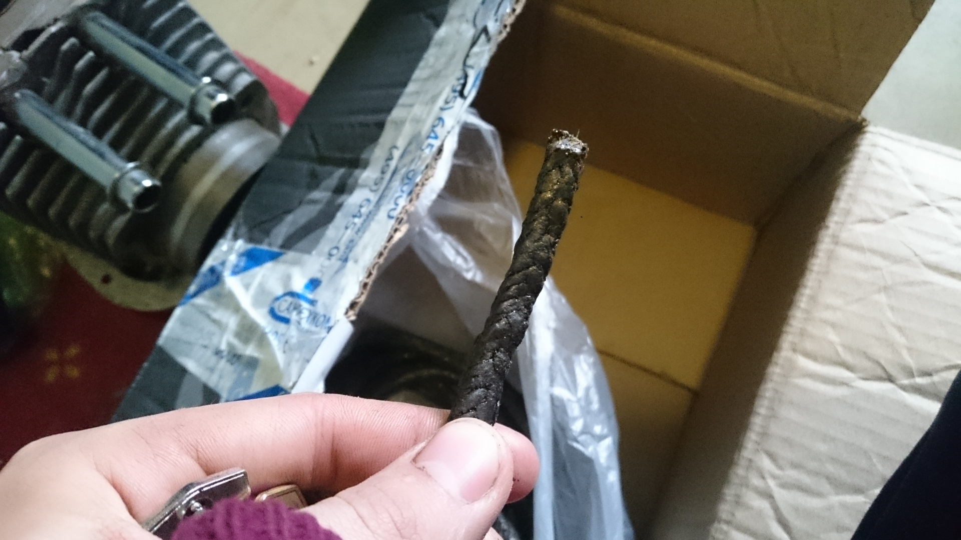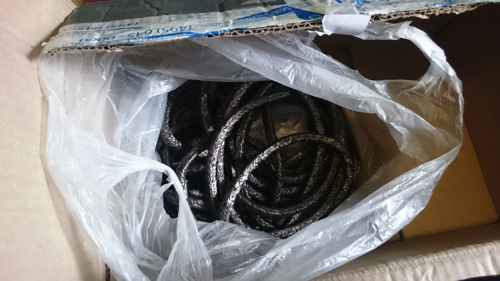 Где-то весной 2017 я закончил восстановление и занялся поиском шнура для использования его в качестве уплотнения. Нашёл очень близкий по характеристикам асбестовый шнур, пропитанный графитом, правда пришлось взять запас на всю жизнь трактора, судя по всему:
