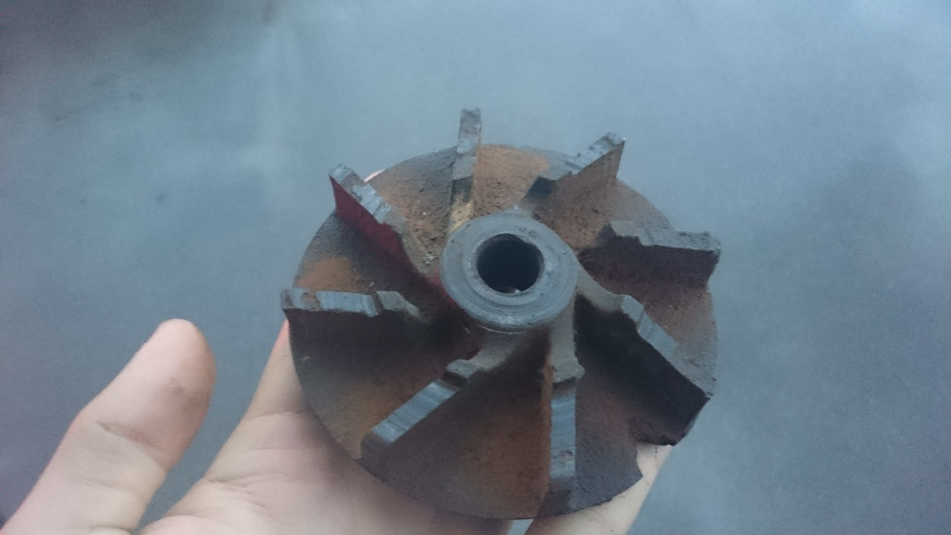 Корпус был отнесен на фрезеровку, а крыльчатка была выровнена вручную (её побоялись обрабатывать в станке, потому что чугун мог легко обломиться). Сначала обработал напильником, затем финально уже готовил на камне и стекле.