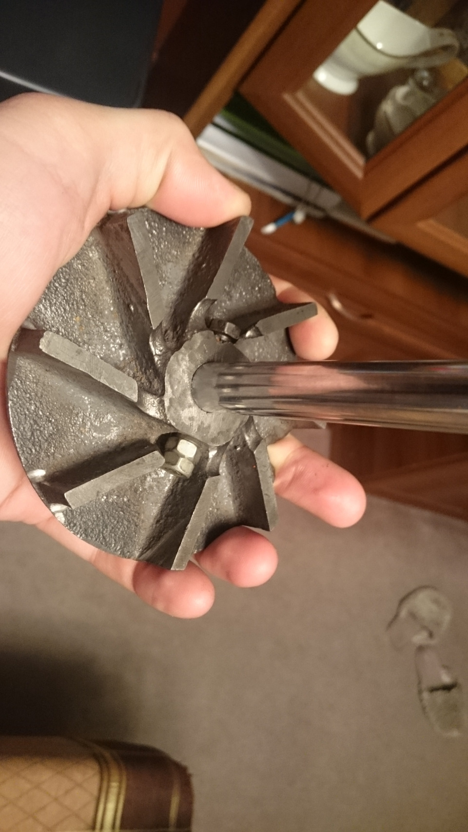 И после этого я стал неспеша собирать помпу. Сначала срасил вал и подготовленную крыльчатку. Поскольку закаленный вал очень проблематично просверлить, то я решил немного отойти от заводской конструкции и сделал вырез в валу: