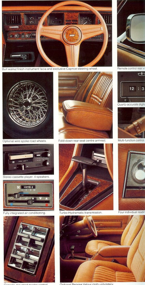 Интерьер определённо был впереди таких конкурентов, как Ford Fairlane/LTD или Chrysler Valiant: каждый подлокотник имел отдельные прикуриватель и пепельницу, а на задних стойках размещались специальные лампы для чтения. В салоне устанавливались передние сиденья от люкс-версии Holden VB Commodore как стандартное оснащение для de Ville, а в Caprice использовались гораздо более функциональные кресла от Opel Senator A. Полностью новые водительская панель и центральная консоль в зависимости от комплектации могли быть окрашены в различные цвета.