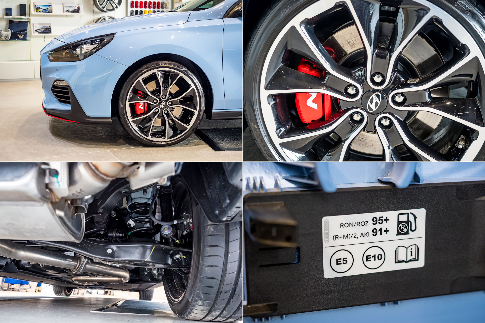 6-ступенчатая МКПП (робот появится позже) имеет систему Rev Matching, то есть автомобиль самостоятельно умеет делать перегазовки при переключениях, чтобы синхронизировать скорость валов. У обеих машин есть лонч-контроль. Базовая версия набирает сотню за 6.4 с, топовая — за 6.1. Максималка у обоих машин ограничена электроникой — 250 км/ч. Также у более мощной машины — увеличенные тормозные механизмы. Диаметр дисков в топе — 345 мм спереди и 314 мм сзади, в базе — 330 и 300 соответственно . В базе колеса Michelin Pilot Super Sport 225/40 R18, в топчике — специально сваренные для i30 N Pirelli P-Zero 235/35R19. Передняя подвеска — МакФерсон, сзади многорычажка, дорожный просвет — около 130 мм.