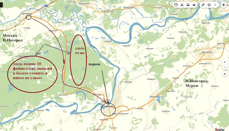 Итак. Если вы идёте по Московской трассе М-7 в сторону Нижнего Новгорода, то в городе Гороховец можно попробовать немножко срезать или с экономить, ну или объехать пост ГИБДД уйдя в сторону, на Тумботино-Павлово. Мне точно тут ближе, потому что я следую в Богородск.