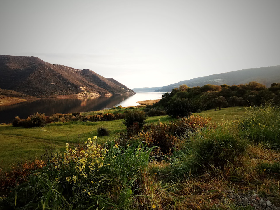 Так как по восточному берегу обогнуть мыс Акамаса не удалось, мы решили зайти с другой стороны – выстроили дорогу в навигаторе до противоположного берега. Maps.me уверенно повел нас проселками, и это оказалась хоть и не слишком стремительная, зато познавательная экскурсия по природе острова. Горы, долины, маленькие деревеньки, ютящиеся на склонах, сменялись как калейдоскоп, и на закате мы снова увидели морские бухты. Поднялись на холм специально ради лучшего обзора, и я пытался хоть как-то запечатлеть все это великолепие –горное озеро вдалеке, бухты, солнечный закат, но ветер так раскачивал машину, что не удалось передать все то, что было перед глазами, на фотографии.