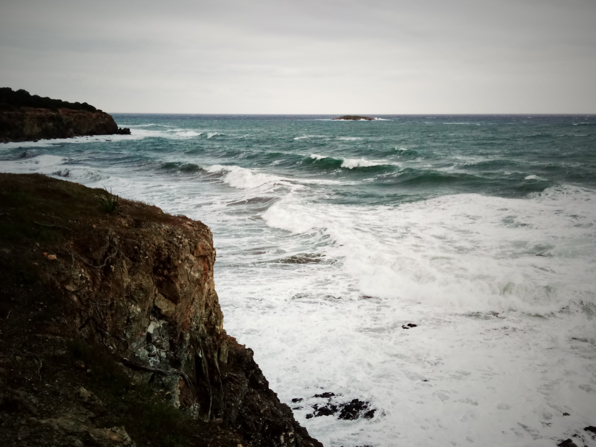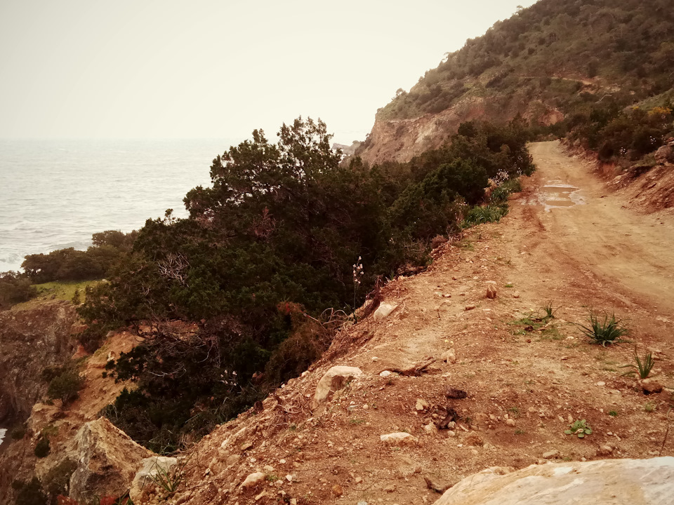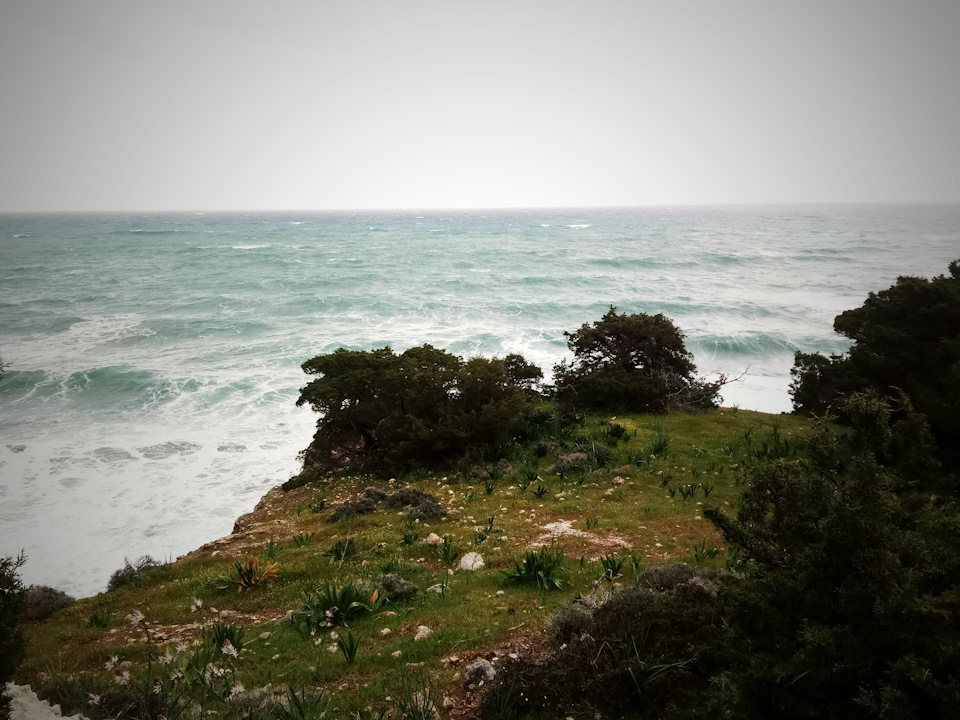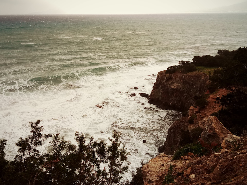 От купальни по побережью шла дорога в желанный Акамас. Помня подъем у водопада, колебался, разворачиваться ли назад или рискнуть на недоприводе, и снова не смог устоять. Да и жена подбивала на дальнейшие приключения) Поехали. Красноватая глина, камешки, красивые склоны, порывы ветра, беснующееся Средиземное море внизу по правую руку – это было так атмосферно!