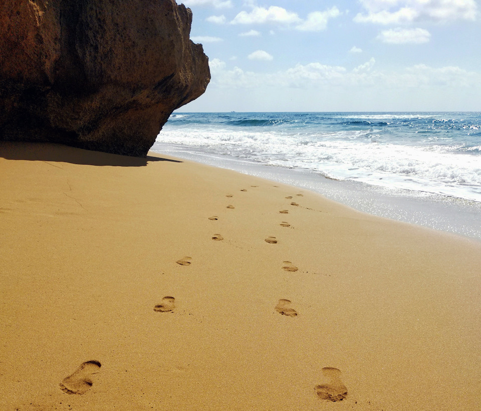 Самого пляжа мы пока не видели — он скрывался за изгибом горного массива. Пришлось осторожно пробираться по россыпи камней, когда-то бывшей частью берега. Шли осторожно, осмотрительно, переходя, а иногда перепрыгивая с валуна на валун. Несмотря на сложность такого передвижения, мы оставались сухими, так как морские волны не могли достать до верха огромных камней, по которым пролегал наш путь. Только в одном месте пришлось промочить ноги, так как буквально пара метров берега оказалась не прикрытой булыжниками, зато сразу после нее показался пляж.